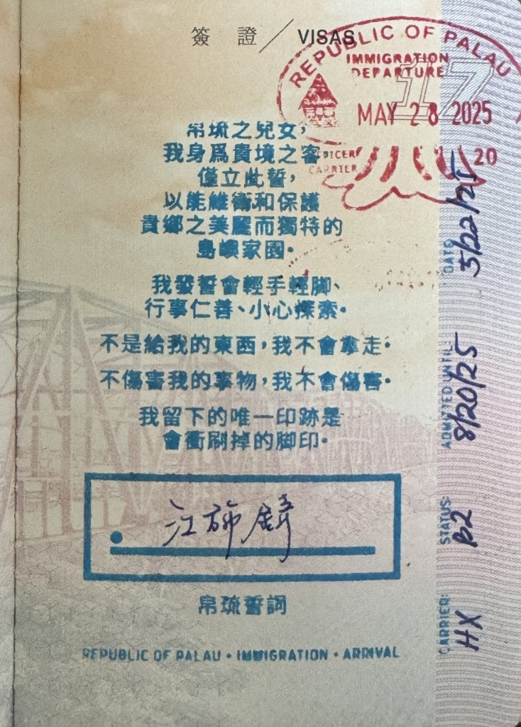 ▲ 海關將《帛琉誓詞》Palau Pledge印在每位旅客的護照上,須簽署後才能入境帛琉。