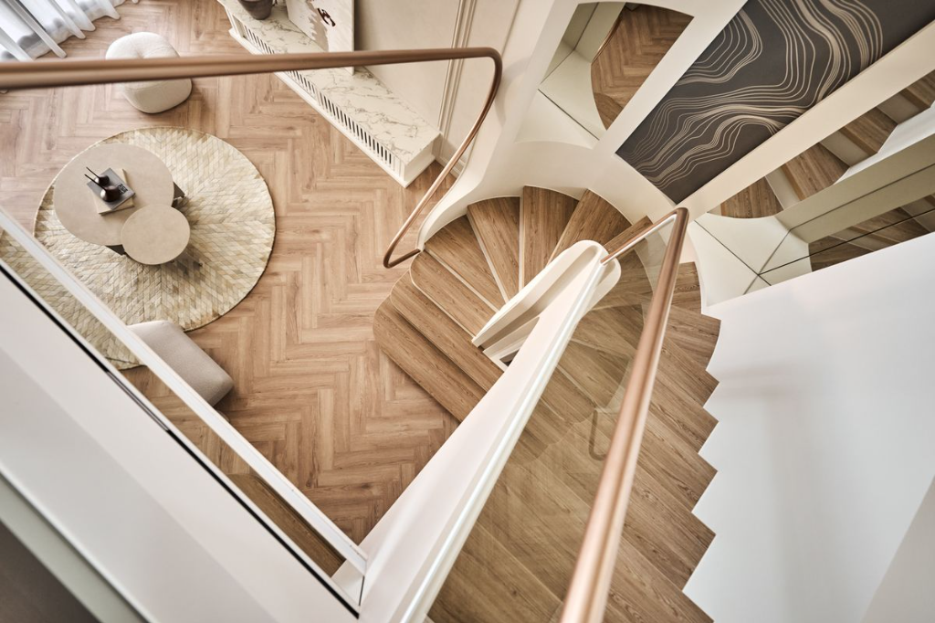 在工法細節上,特別打造半圓形的旋轉樓梯,從各個角度表現出流暢的弧形造型,與周圍形成自然而連貫的銜接,並使空間往上蜿蜒,讓視覺流動自然向上,並在旋轉樓梯的外圓處規劃壁龕,賦予展示收納機能,上方使用內凹半圓的柱體延伸至閣樓空間。樓梯扶手設計以鐵件搭配金屬漆,透過一體成形的質感延伸放大視覺到閣樓,其中樓梯的壁面以進口壁紙鋪覆,營造空間端景,並呼應與沙發背牆相同的造型語彙;電視牆以兩種不同的特殊漆呈現,營造多層式的豐富紋理。