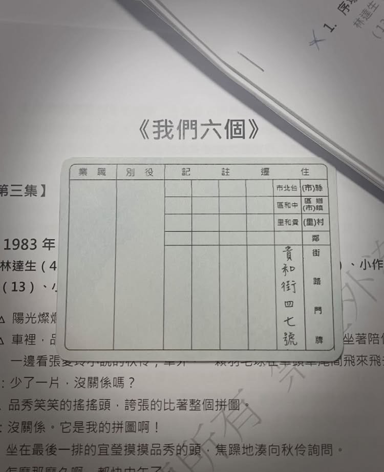聊到最難下戲的一場,潘親御、何潔柔異口同聲都說是小孩們在靈堂前向媽媽告別的那一幕,兩人拍完仍繼續哭,都難以下戲。拍完《我們六個》後,潘親御也感性地說「會更懂得珍惜身邊的人,會好好地溝通,給他們多一點的愛」,不只有滿滿感想,更有難得想收藏的道具,潘親御還把劇中美術組做的「林作賢」身分證帶回家保留做紀念,也讓導演和「林作賢」本人都說太特別了,這很有年代感的。
