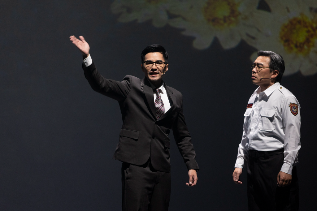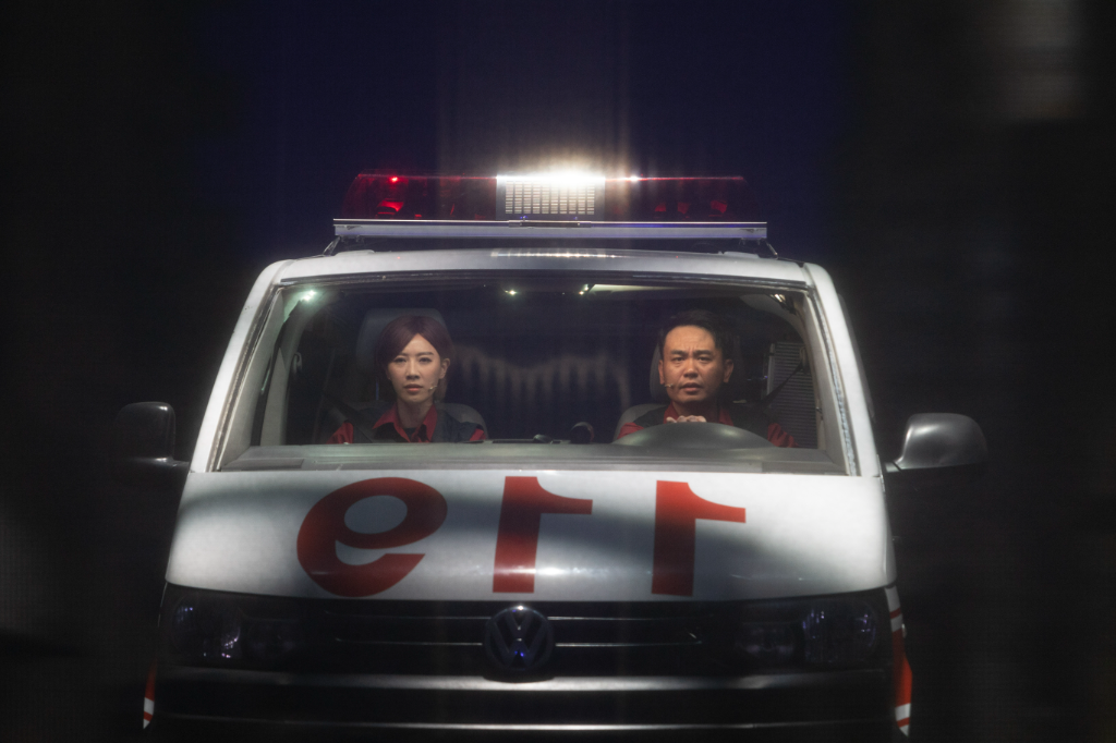 ▲ 舞台上出現的救護車,令觀眾驚呼不已。圖右為楊大正、左為方宥心。(圖:故事工廠)