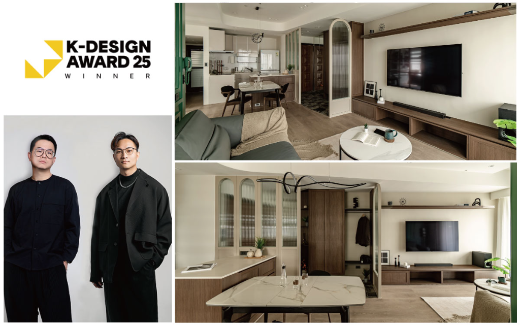 品牌總監 趙國豪、設計總監 楊翊 以奶茶調性的簡約畫面營造柔和氛圍,綴點深綠與胡桃木色,為作品《青苑遊》贏得2025韓國K-DESIGN AWARD「Winner」殊榮!設計中融合眾多異國元素,並以空間氛圍連結居者往昔的快樂旅居回憶,藉大地色系搭配圓弧、線條等造型,令居者清晨時振奮精神、歸宅後舒緩身心,並統整各項所需,沿動線鋪設便利機能,呈遞一處切合住者喜好需求的夢想家宅。