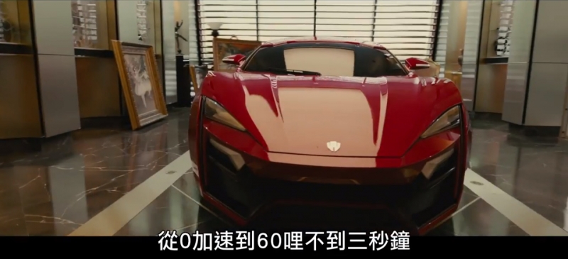 【玩命關頭7】超吸睛的Lykan超跑,不僅速度最快,數量更是稀少,2013年僅生產7輛。除了飛快的車速,白金、鑽石和藍寶石等頂級裝飾也是賣點!