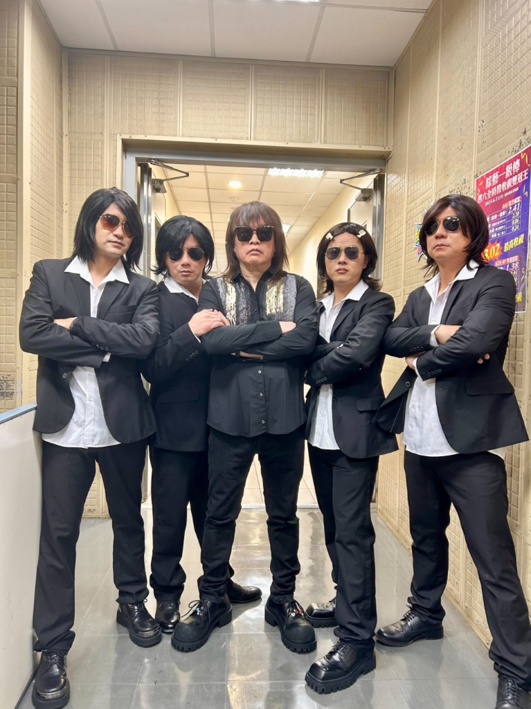 ▲ 《綜藝一級棒》(左起)吳俊宏、彭正、康康、陳孟賢、陳隨意扮成伍佰老師戲稱是「1500」。(圖:中視)