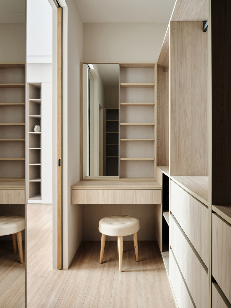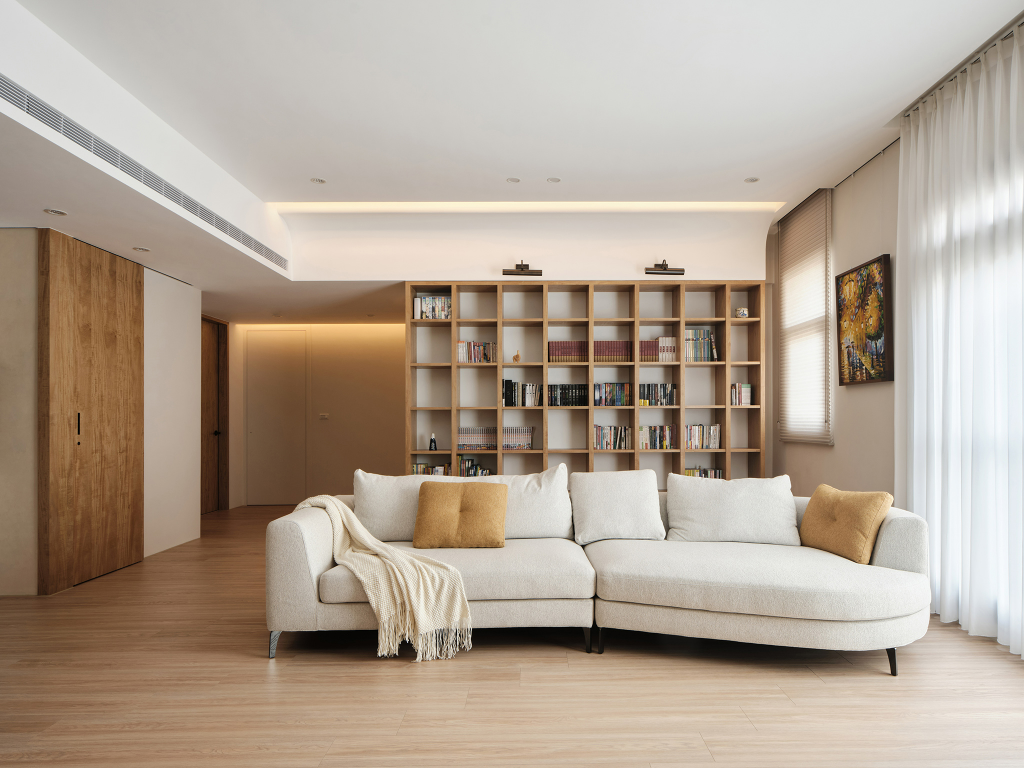 考量到屋主愛好整潔,團隊在空間佈局與機能設施的配置上,除了滿足生活基本的安全、健康與舒適度之外,亦有採取簡約俐落的設計,讓空間能兼具實用與美觀。其中,因應屋主需求於廚房設置一座大型中島,不僅能作為屋主居家辦公的場所,還能作為家人團聚、互動的空間。此外,為給予藏書眾多的屋主一個海量的收納空間,客廳沙發刻意採不靠牆設計,以此讓出書架的擺放空間,讓居所也能擁有圖書館般的閱讀區域。