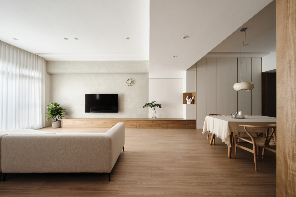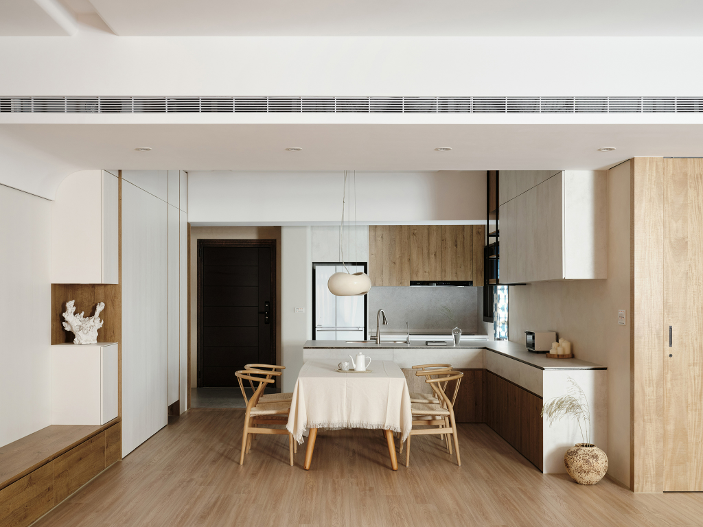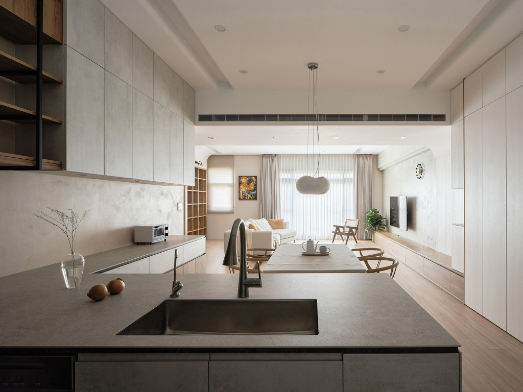 為給予居者寬敞、舒適的生活環境,團隊採用開放式的設計將客廳、餐廳與廚房做整合,再導入弧形倒角做修飾,以此提供居者安全、自在活動的空間尺度。其中,天花板同樣採用圓角進行修飾,再搭配適當的間接照明設計,能有效消弭天花與牆體間的分割感及壓迫感。