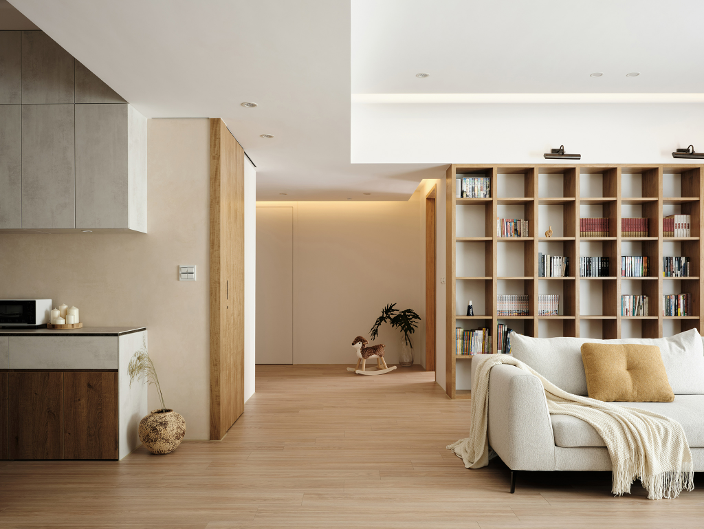 甫入落塵區,團隊巧妙利用磁磚與木地板的材質差異劃分出區域性。向內走去,空間先以白灰漸層的色彩計畫延伸視覺感受,而後再以大量的木作保留為居所營造出溫潤質感。