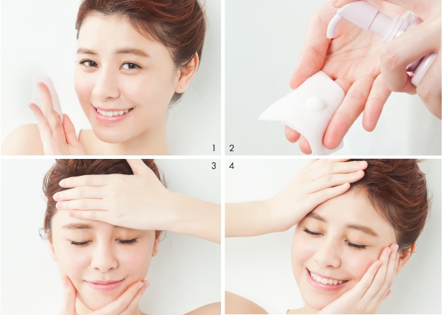 於洗臉後以化妝棉取適量(約按壓3下),點於額頭、兩頰、鼻子與下巴後充分按摩全臉,能幫助肌膚更容易吸收淨白成分。
