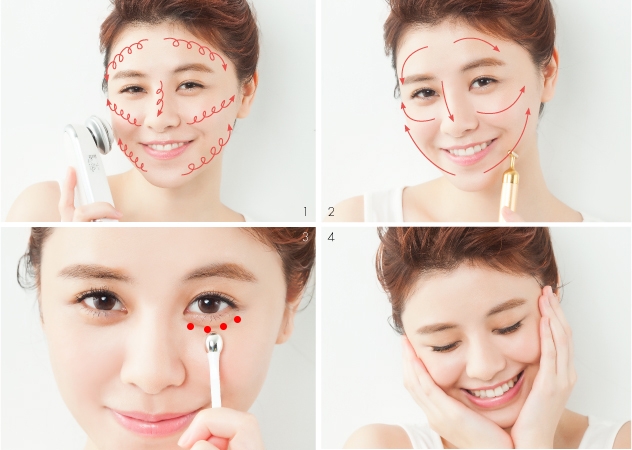 如果使用的是圓形導入頭的儀器,可以採用由向外畫圈按摩的方式,來幫助塗抹於臉上的精華液充分被吸收。