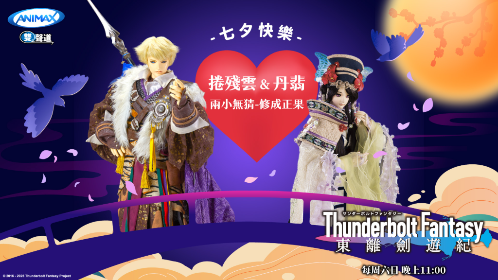 七夕戀曲即將響起,《Thunderbolt Fantasy 東離劍遊紀》今年夏天登上優質動漫頻道ANIMAX,該劇集官方唯一認證CP丹翡和捲殘雲也在社群甜蜜放閃,這對從並肩作戰的盟友進化成相守終生的戀人,成為粉絲心中不敗的情侶典範,也為布袋戲劇集注入浪漫色彩!ANIMAX 總經理吳曉蘭表示:「七夕是關於愛與相遇的節日,《Thunderbolt