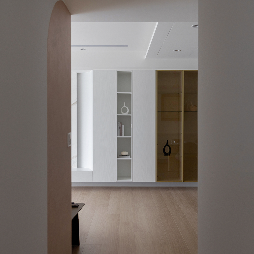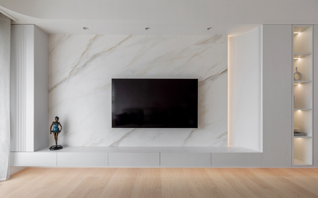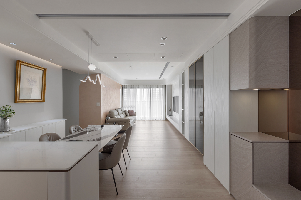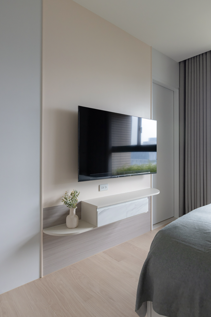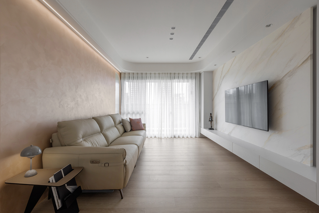 在縱深較短、格局狹長的公共空間中,澄采設計透過懸挑電視櫃、弧形收邊與天花板的圓縫收邊設計,柔化結構線條,弱化壓迫感。