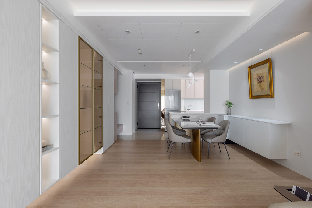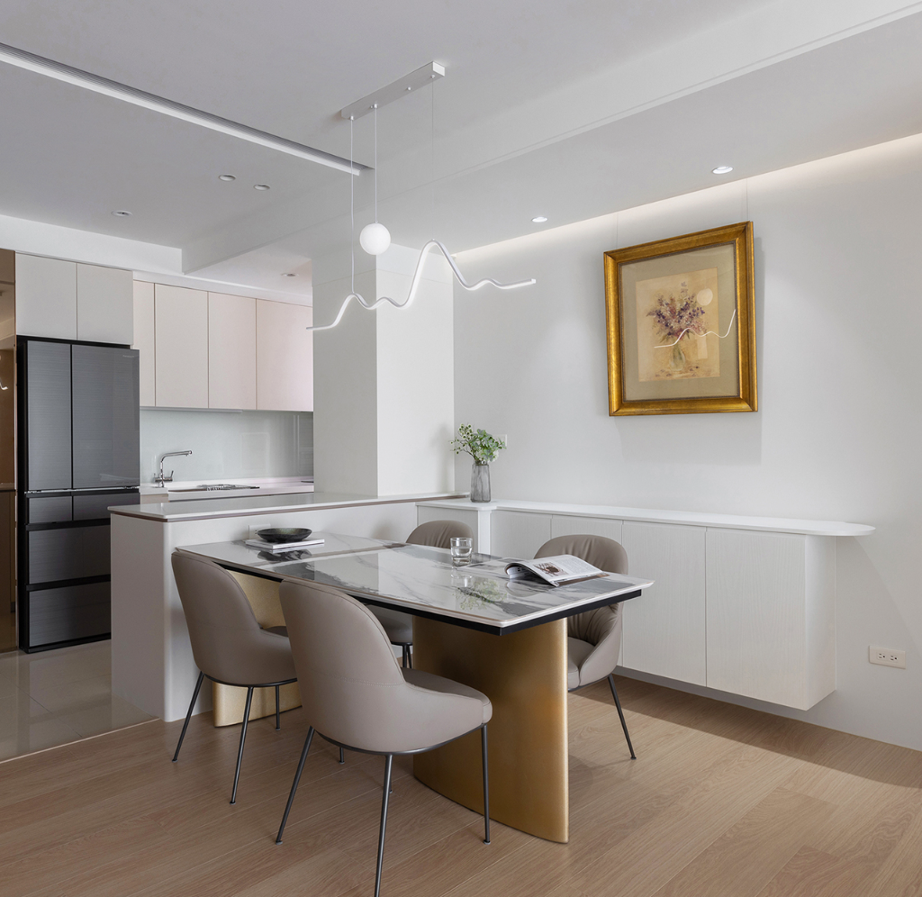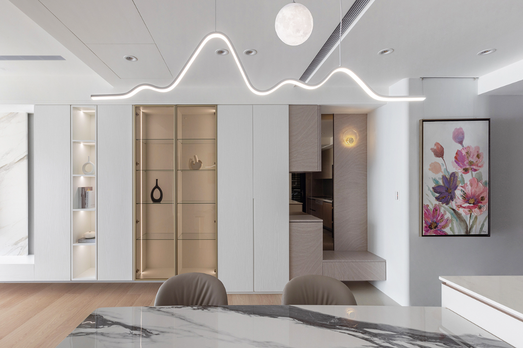 玄關落下一幅絢麗奔放的花卉畫作,如綻放的迎賓之花,為整體柔和色調注入躍動氣息。開放式廚房以一座吧台緊扣餐桌,成為家庭凝聚的核心。吧台不僅銜接料理與用餐機能,更延展出備餐、電器與展示的複合機能,成為視覺與使用動線上的雙重焦點。