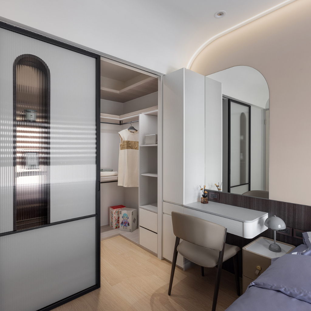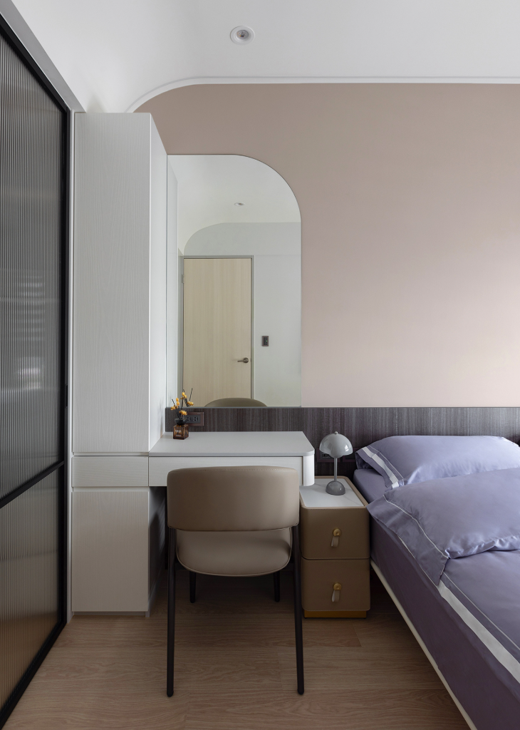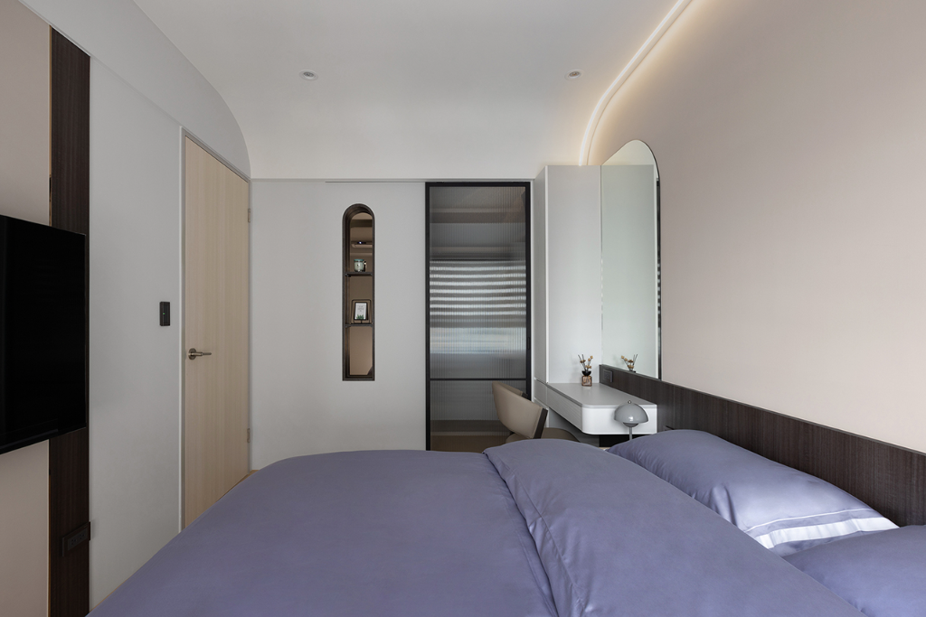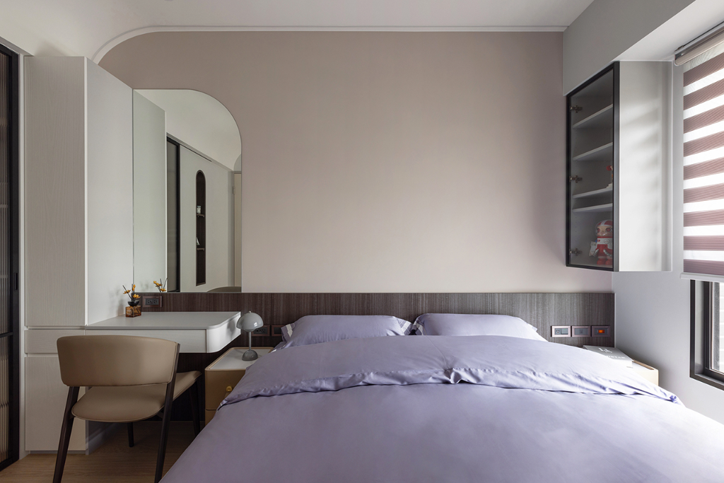 整體色調以白與淺木色為基底,揉合石英石、陶板磚與皮革紋木皮等材質,營造溫潤沉穩卻不失層次的視覺體驗。臥室部分設計為雙主臥,各自擁有獨立風格與色彩語彙,一間以柔和暖調搭配皮革紋木皮與線板造型,另一間則以紫黑木作展現沉穩個性,彼此交錯卻又和諧共存。