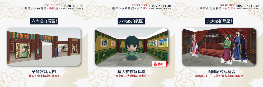 第四大是「腳色宮廷風卷軸區」場景牆另一側則展示多位主要角色的精緻卷軸,貓貓、壬氏、高順、小蘭、樓蘭妃、里樹妃與梨花妃一字排開,宛如親身步入宮廷深處。隨後進入「氣勢主視覺」,歷季的經典主視覺也完整呈現,讓粉絲拍照打卡一次蒐集。最後是本展區最大亮點3米高的貓貓氣偶即將降臨快閃店,將會依照監修狀況解禁,粉絲朋友盡請期待。