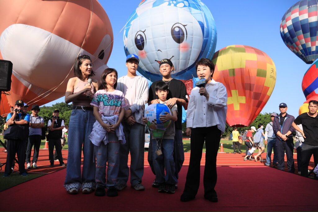 【民眾網諸葛志一臺中報導】「台中石岡熱氣球嘉年華」29日起至8月31日在土牛運動公園熱鬧登場,共有來自日本愛媛縣的吉祥物「蜜柑狗狗」及石岡在地吉祥物「水滴寶寶」等15顆繽紛熱氣球輪番升空,並搭配煙火秀、音樂演出與光雕噴火秀,帶來繽紛絢麗的視聽饗宴。市長盧秀燕29日更與舉家遷入票選全台最幸福宜居台中的藝人夫妻阿Ben、徐小可率先搭乘熱氣球,並熱情邀全國民眾造訪石岡,體驗「好吃、好看、好玩、好住」的山城魅力。