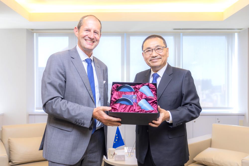 【民眾新聞葉柏成新北報導】歐洲經貿辦事處處長谷力哲(Lutz Güllner)昨(28)日拜會新北市長侯友宜,除歡迎新北加入「歐盟國際城市夥伴計畫」,也感謝市府長期積極推動國際交流。雙方就經貿合作、高科技產業鏈結及國際政經局勢深入交換意見,盼能持續深化新北與歐洲的合作關係。