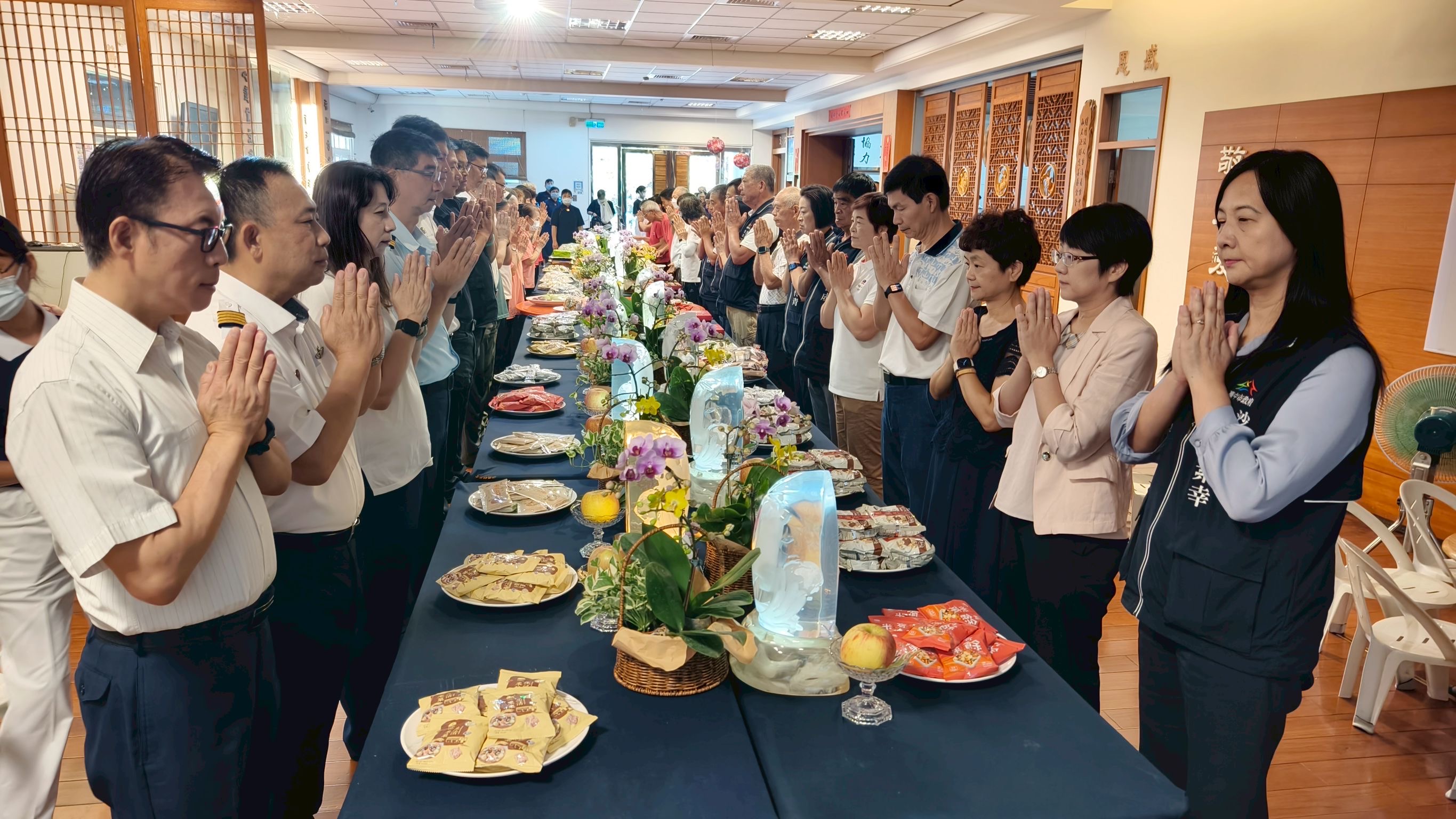 一樓獻供組,有獻燈人員,人人以恭敬心,祈願心燈內外明亮;獻果者,祈願善因皆得善果;獻花者,祈願遍地圓滿吉祥。