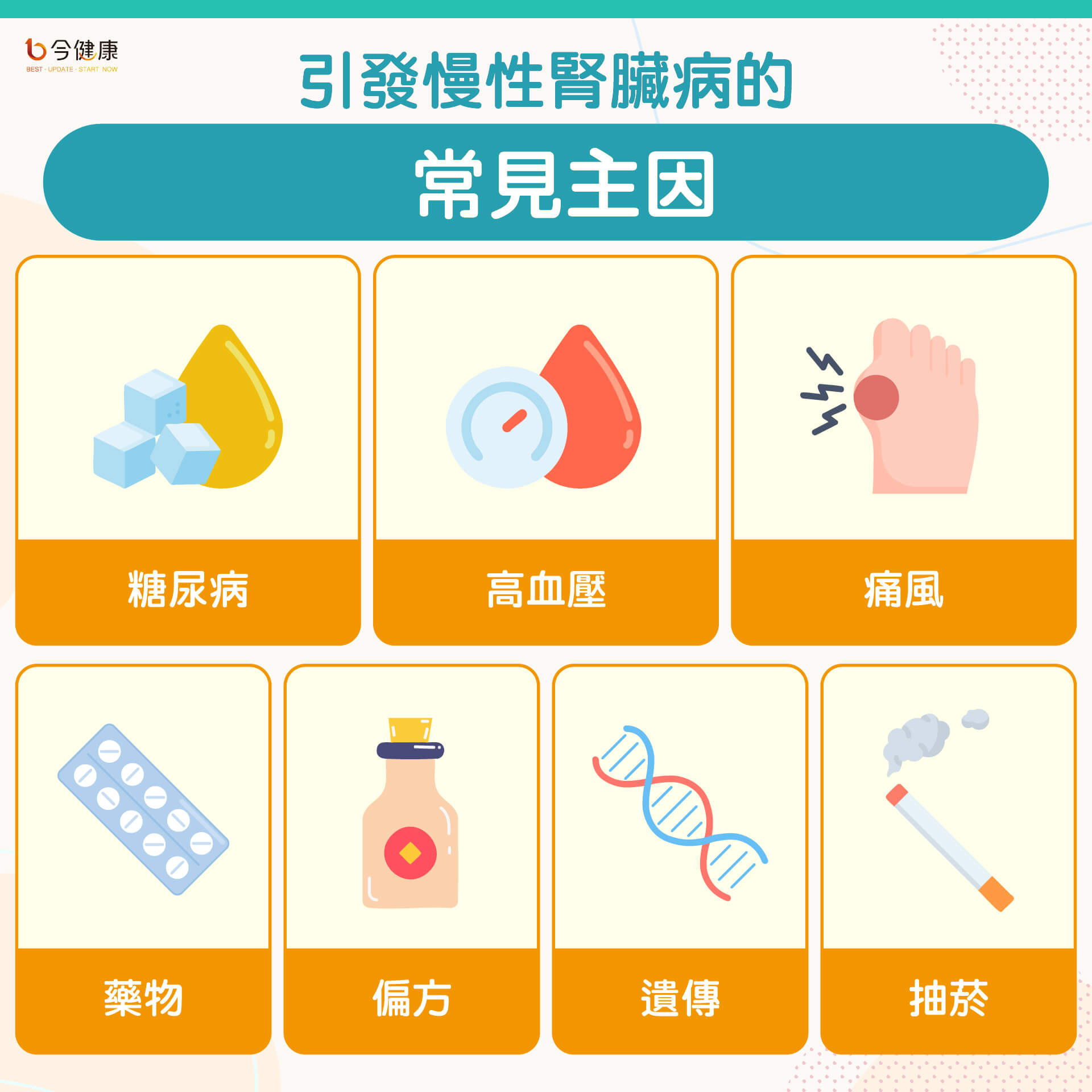王婷翊醫師表示,腎臟病可為多種因素形成,除了和遺傳有關,例如多囊腎,也包含和飲食生活息息相關的糖尿病、高血壓、痛風。尤其臨床上糖尿病為腎臟病最常見的成因。而有抽菸習慣的民眾,也得留意香菸會使血壓升高間接傷腎、有害物質也會對腎臟造成直接傷害。