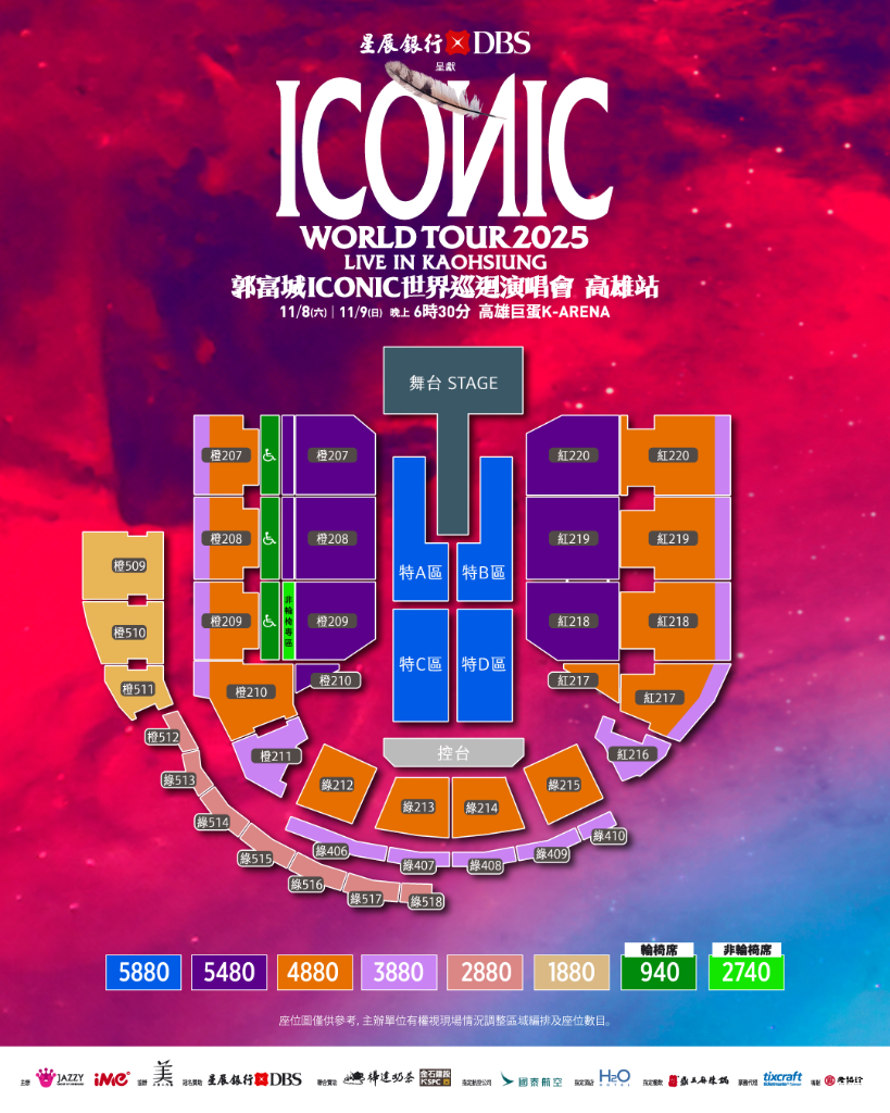 「星展銀行-郭富城ICONIC 世界巡迴演唱會」追加場次將於2025年11月9日(日)在高雄巨蛋登場,演出票價NT$ 5,880 / 5,480 / 4,880 / 3,880 / 2,880 / 1,880,輪椅席NT$940、非輪椅席NT$2,740。星展卡友可於9月5日上午11點搶先購票,一般售票則於9月6日11點在拓元售票系統全面開賣。更多資訊可參考主辦單位爵士娛樂或iMe臉書粉絲專頁。