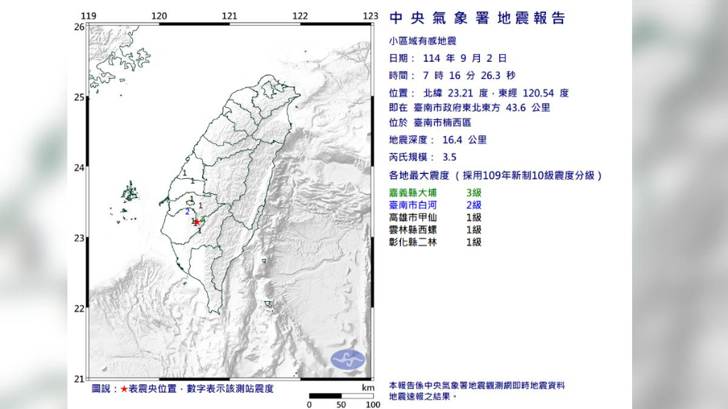 今(2)日上午7時16分台南市楠西區發生芮氏規模3.5的小區域地震,震央在台南市政府東北東方43.6公里處,深度16.4公里,屬於極淺層地震。而這起地震觀測到最大震度為3級,出現在嘉義縣大埔。