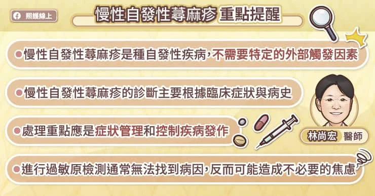 「很多患者認為蕁麻疹與特定食物或環境因子有關,因此會要求進行全面過敏測試。」林尚宏說,「實際上,慢性自發性蕁麻疹是一種自發性疾病,不需要特定的外部觸發因素。進行過敏原檢測通常無法找到病因,對於診斷和治療的幫助有限,反而可能造成不必要的焦慮。慢性自發性蕁麻疹的處理重點應是症狀管理和控制疾病發作,而非過度依賴檢查或頻繁換醫師。」