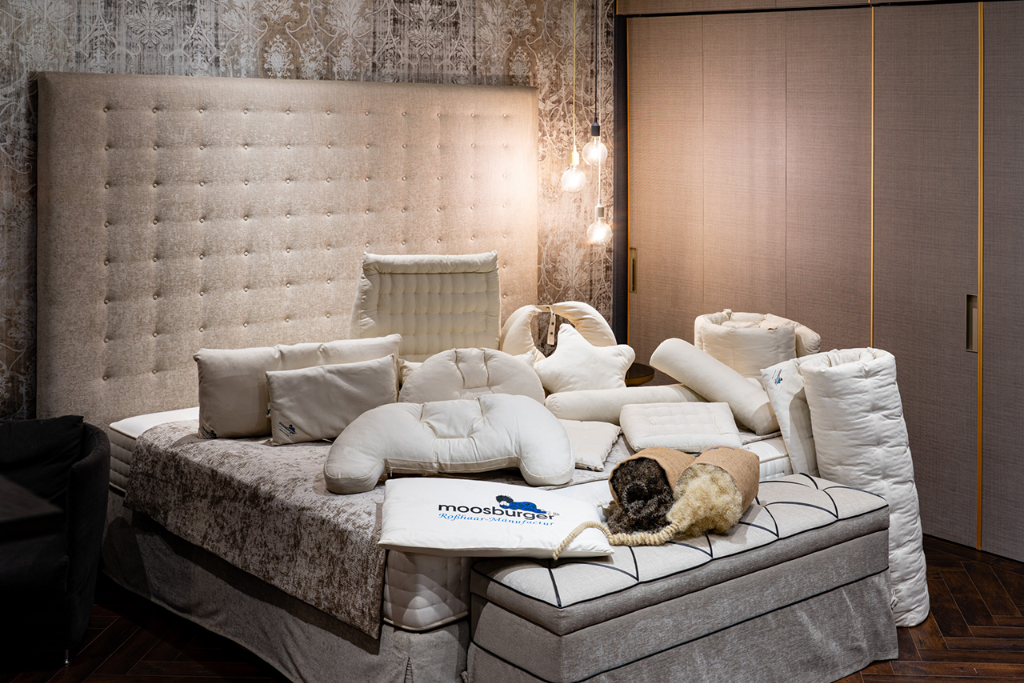 繆思伯格則以馬毛為主要材質,開發出側睡專用的馬毛側睡枕與愛心H枕,貼合頸肩曲線,保持呼吸順暢。馬毛薄墊與坐墊同樣強調透氣與支撐力,讓每一次休息、每一次坐下都能感受到天然材質的溫度與細膩。它們看似低調,卻能在夜深人靜時,讓身體完全休息,徹底消除所有疲勞。特別值得一提的還有「PureBeds床架+雙層床墊系統」,承襲德國百年工藝,下層彈性面板靈敏感應體重變化、上層以天然墊材維持睡姿穩定,整體結構透氣、靜音、減壓,是高品質睡眠的理想幫手。