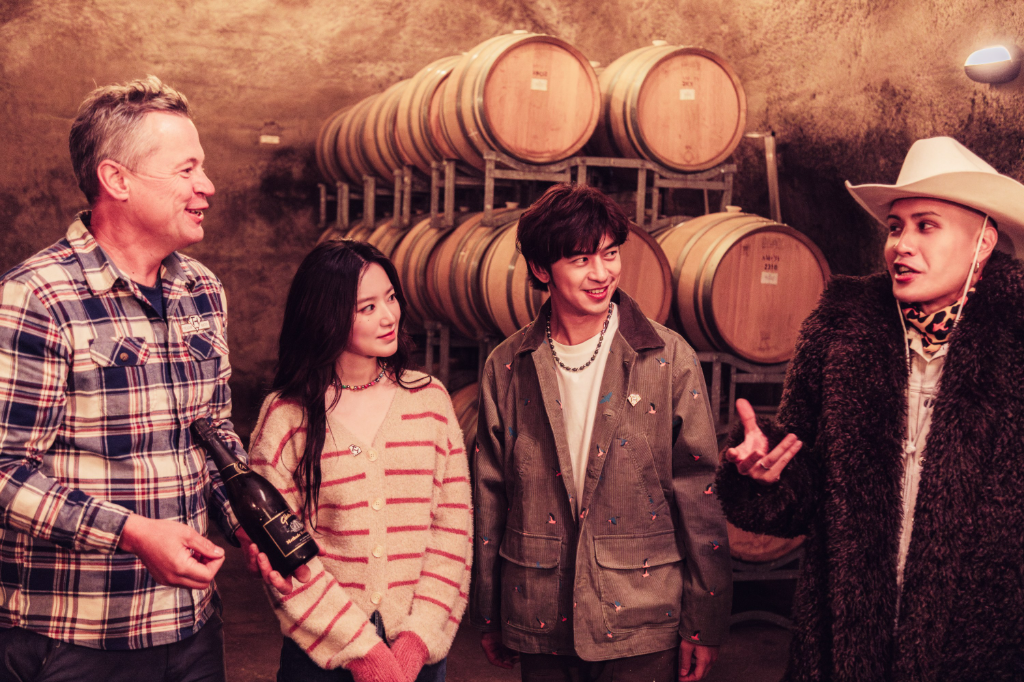 ▲ 黃宣(右起)、舒華、陳柏霖隨著釀酒師在酒窖內參觀釀酒過程。(圖:出去一下)