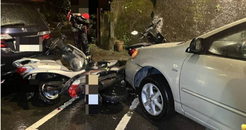 內湖警方指出,這起事故發生在今日晚間6時17分。當時正下著間歇性豪雨,張姓婦人駕駛自小客車沿環山路二段往東行駛時,車輛突然打滑失控,隨即撞向路邊停車格。張婦駕駛的車輛車頭嚴重毀損,路邊停車格內7部停放的機車也遭受波及,紛紛倒地,零件四散。