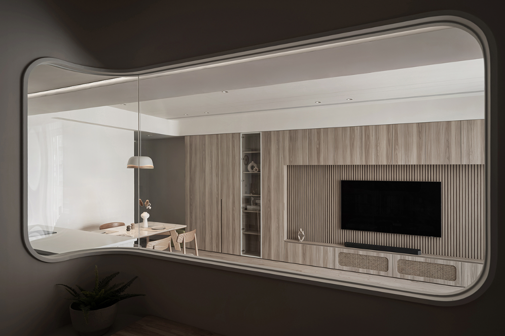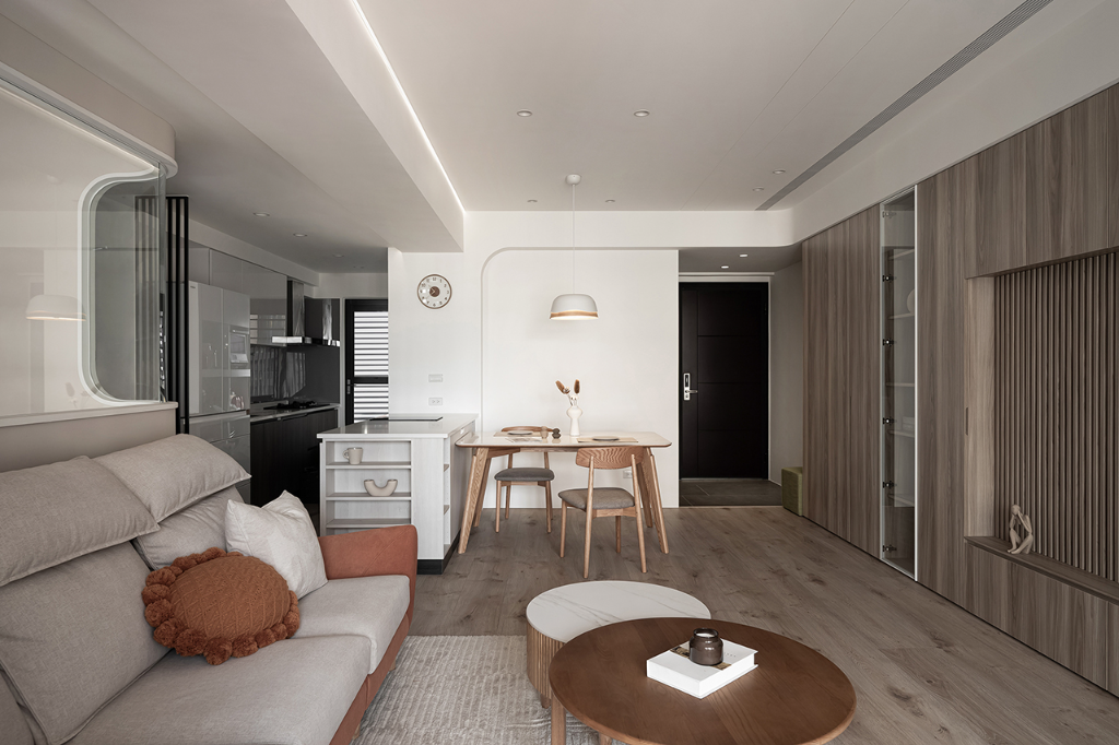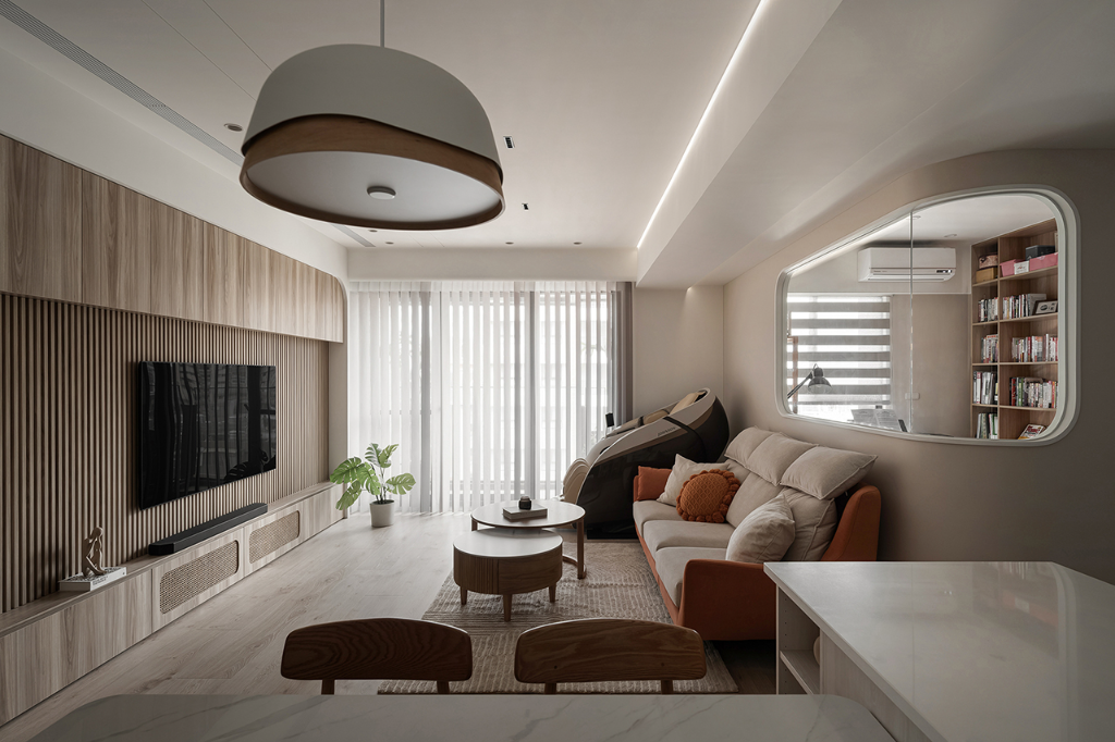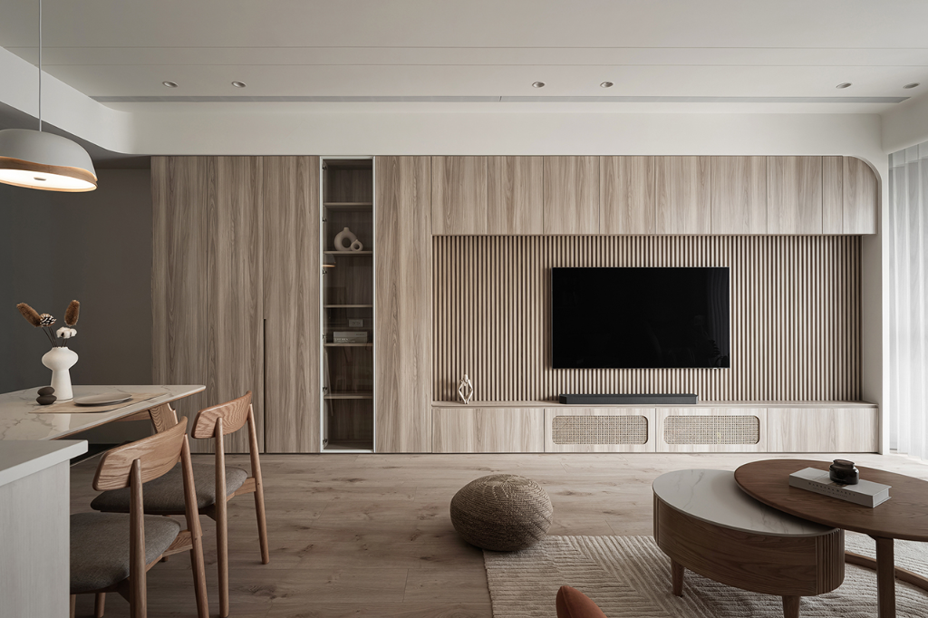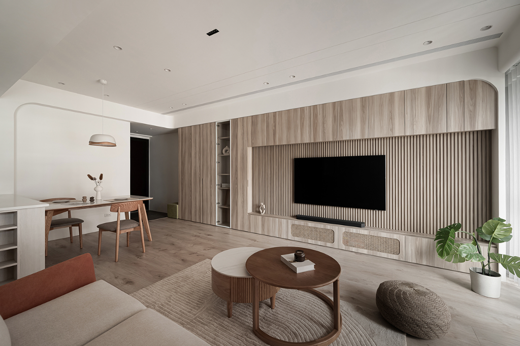 循著動線前進,公領域的視野豁然開朗。客廳與餐廳並無實體隔間,而是以開放式格局相連,使光線與空氣自由流動。客廳電視牆以溫潤木料打造,從玄關入口一路蜿蜒至陽台落地窗邊,創造出視覺上的連續感。電視後方運用細膩的木格柵增添層次,而下方電器櫃的藤編設計,不僅與整體木質調相互呼應,更兼具散熱功能,展現機能與美學的和諧共存。值得一提的是,設計師在居家中大量採用圓弧語彙,從電視牆的收邊、餐廳旁的牆面造型,到書房的轉角,溫潤弧線猶如輕柔的筆法,消弭了空間稜角,叫人身處其中,身心都感到無比放鬆。