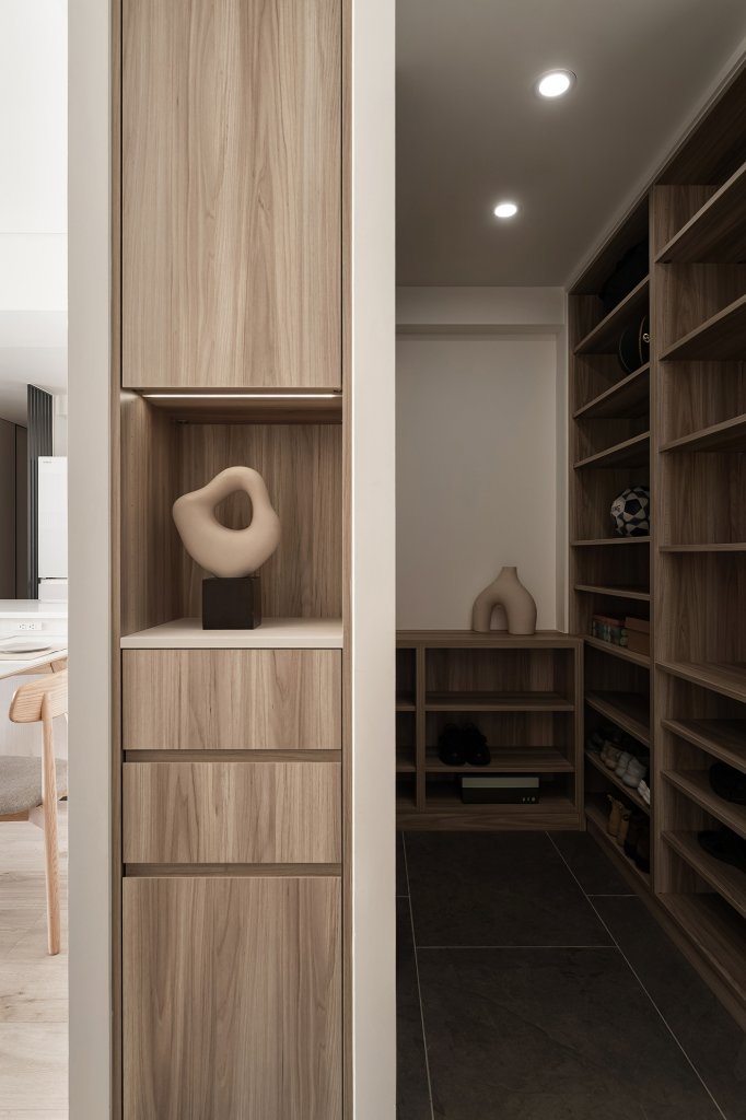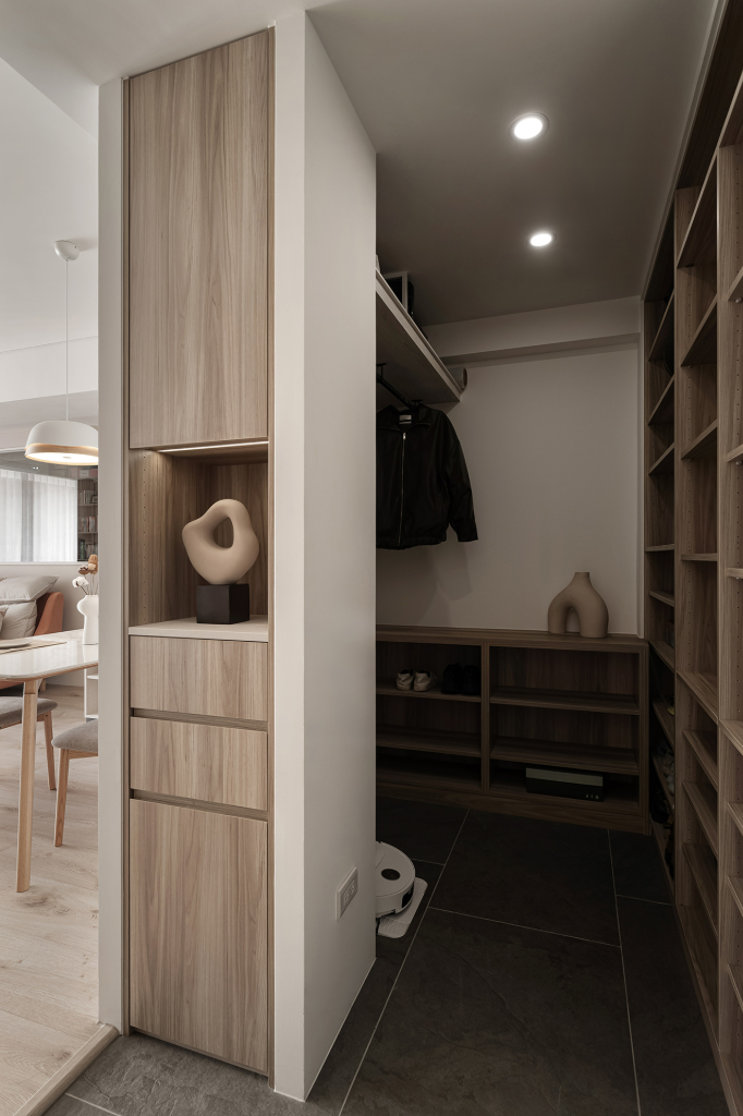 當推開門扉,迎面而來的是一片開闊的步入式收納區,強大儲物機能足以安頓全家人的鞋履與外出衣物,且設計師在此安裝通風口,並搭配全熱交換器,令空氣保持對流,杜絕異味滋生,讓清新氣息洗去滿身的勞累與疲憊。