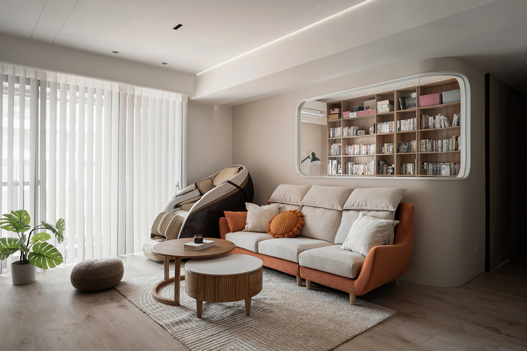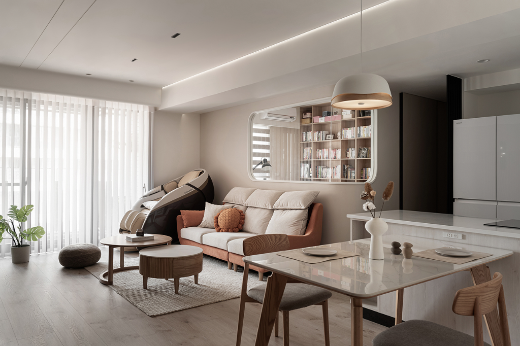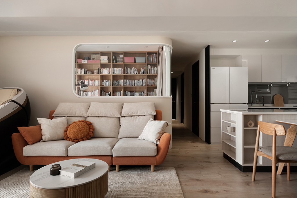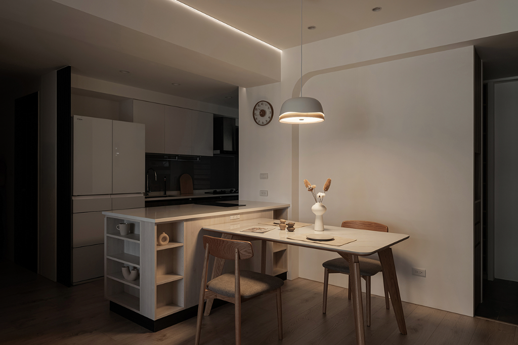 開放式餐廚區是全案的核心,亦是女主人最鍾愛的場域。廚房透過中島與餐桌連結,形成流暢動線。中島立面特別裝設開放式層板,方便隨手收納杯盤,將實用性與美觀完美結合。餐桌天花,一盞圓潤的造型吊燈靜靜垂掛,當夜幕低垂,柔光灑落,便將此處化為溫暖靜謐的一隅。無論是家人在此一同用餐、閱讀,或是輕聲閒聊,都顯得自在愜意,構築出一家人最溫馨的日常畫面。而為了不讓住宅的色彩過於單一,設計師在簡約的木質基調中,特意挑選一張橘色沙發,藉由這一抹跳躍的色彩,畫龍點睛般為空間注入活潑生命力 。