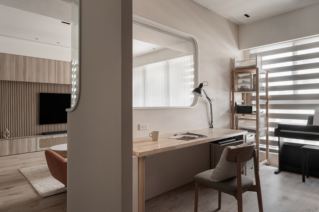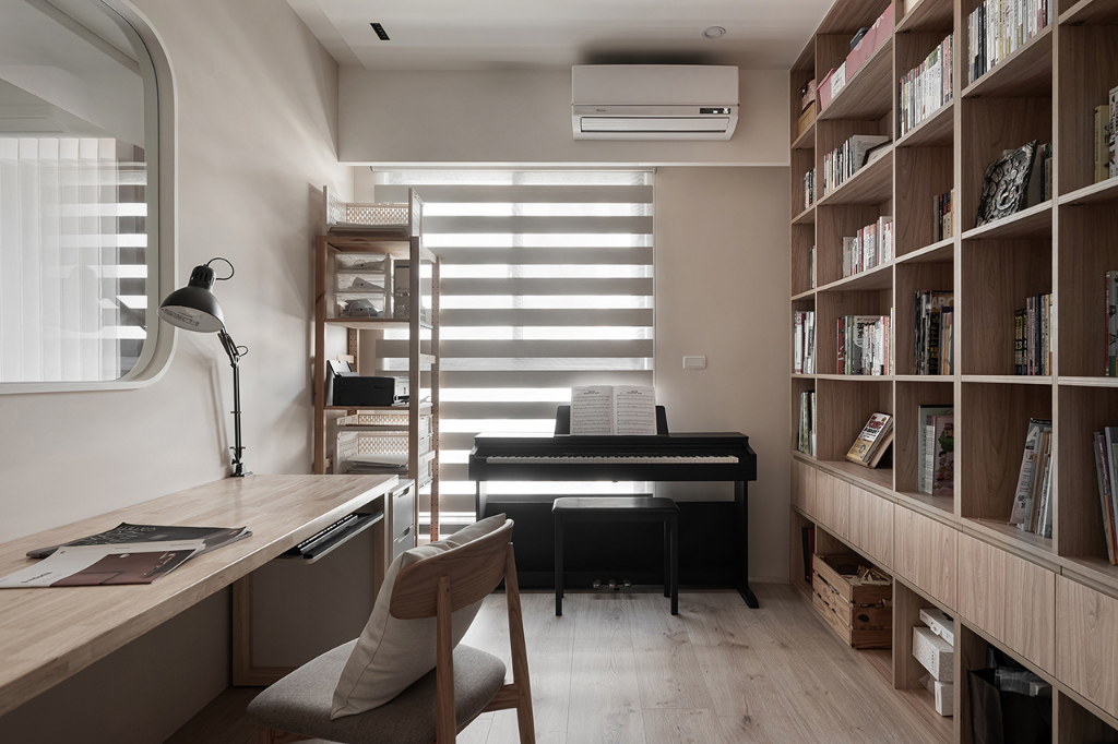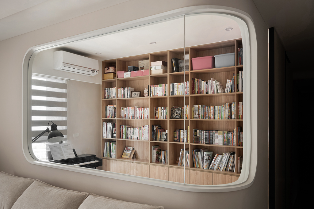 客廳後方,是一處以罕見弧形玻璃與公領域相隔的書房。這片玻璃不只維持了視覺的通透度,更利用溫柔線條,巧妙化解傳統紅磚隔間可能造成的壓迫感。書房中大量使用實木,從書桌、書架到地板,都散發著沉穩的親切氛圍,形塑安心閱讀與工作的理想環境。這裡不僅是男主人專注的角落,也能隨時成為琴房,讓琴聲流淌其中。最讓人感到驚喜的是,當有親友來訪時,這片私密天地只需將窗簾輕輕拉上,便能立刻轉變為一間舒適客房,賦予居所多元實用的可能。從書房往外眺望,弧形玻璃讓風景具備一絲趣味 ,而其遠比一般隔間更為繁複的工藝,更默默訴說著設計師的用心。