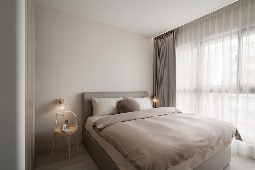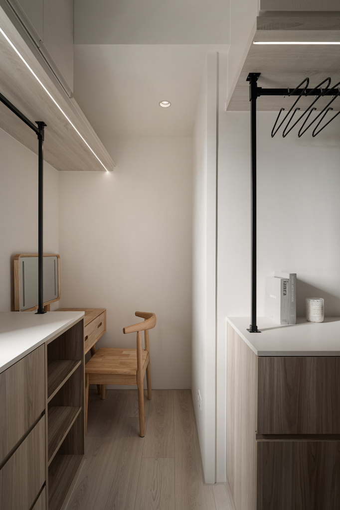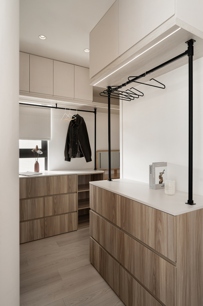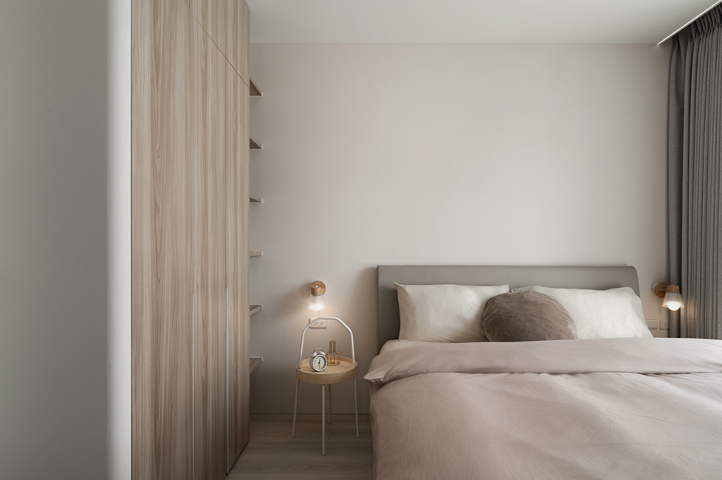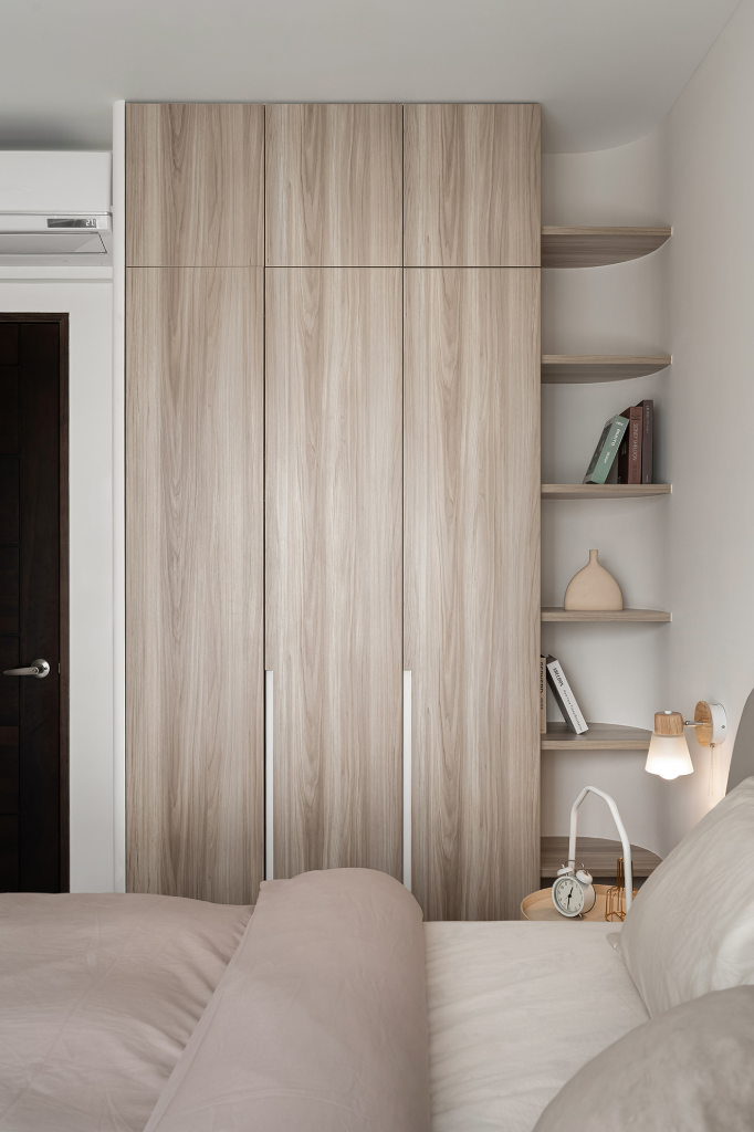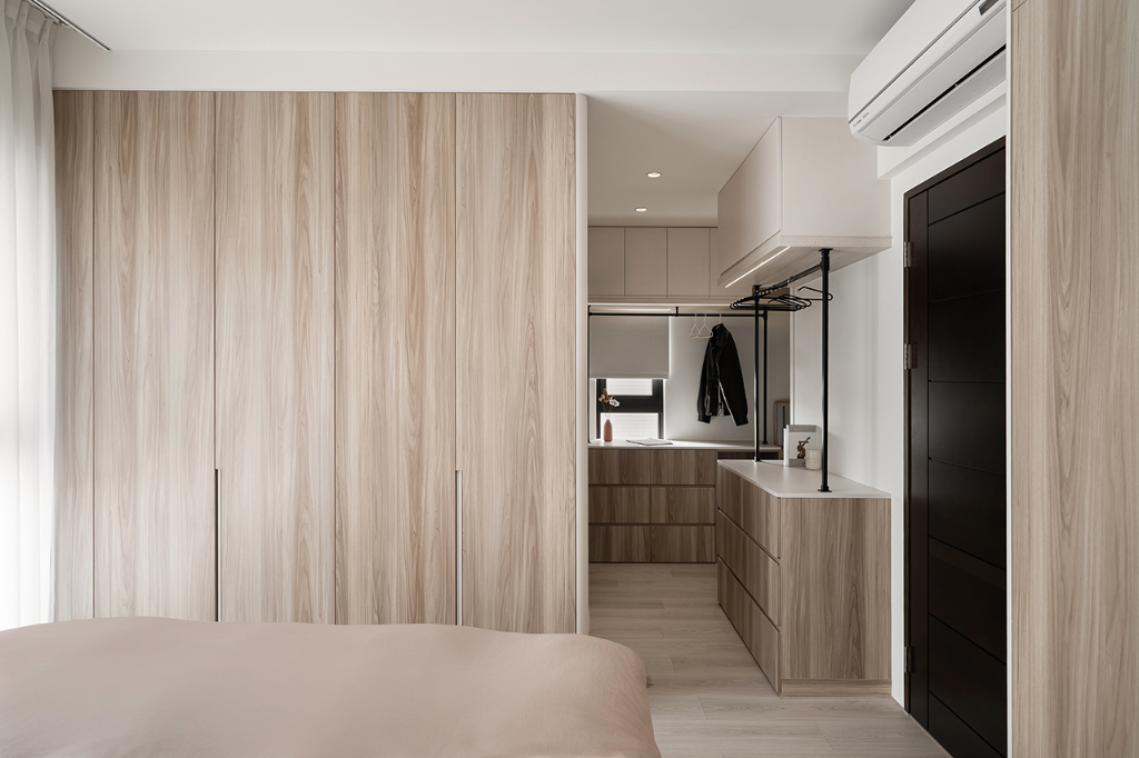 穿過客廳與餐廳之間的廊道,步入私密的生活領域。主臥室將原有的次臥空間巧妙納入,由此延伸出一處寬裕的更衣室與梳化區。同時主臥室延續公領域的木質調風格,並在床邊櫃體的開放與封閉設計中,融入圓弧細節,讓這片不受干擾之地顯得既寧靜又充滿溫柔質感。