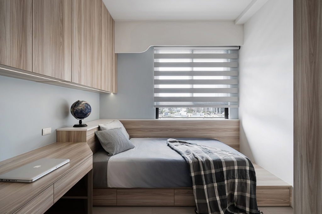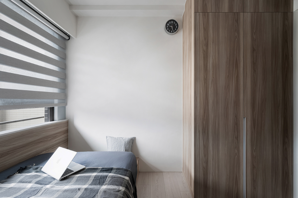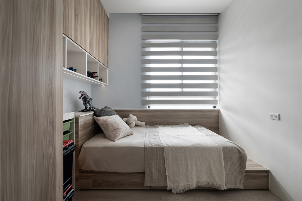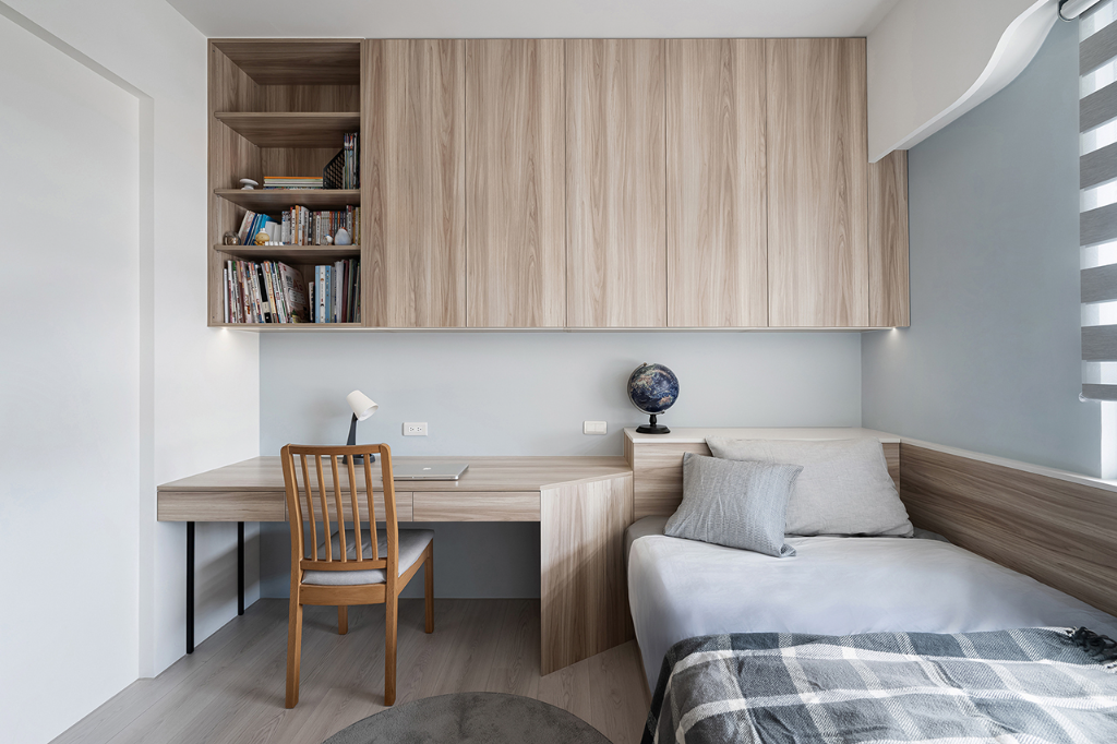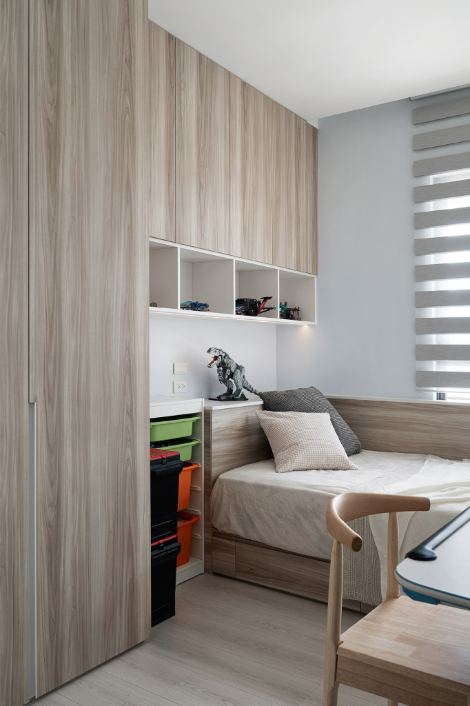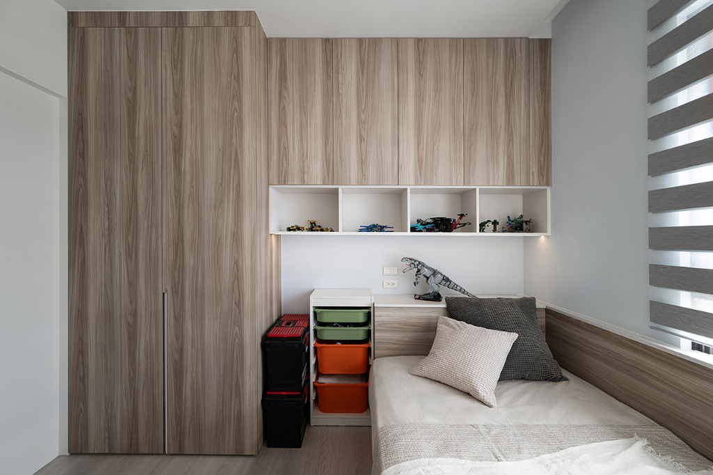 兩間男孩房則依循各自的個性,給予不同配置。面積有限的弟弟房,透過將床鋪墊高來爭取更多機能,床架下方的抽屜可妥善收納雜物,而與衣櫃相連的床頭儲物櫃,也將機能發揮得淋漓盡致,配合木質語彙為主軸,勾勒出溫馨安穩的氣息。至於哥哥房則在木質調之外,輔以淺藍色牆面,清爽用色恰如其分地展現大男孩的純粹個性。屋主將較多空間留給公領域,是希望家人們能有較多時間在此聚集、交流,因此臥房設計相對單純,主要作為純粹休憩與充電之用。