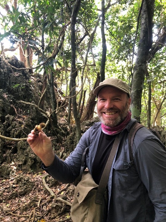 此次榮獲優等的崔佛(Trevor Padgett),為生物多樣性國際研究生學程博士班學生。來自加拿大的他,自 2021 年起就讀於由中央研究院生物多樣性中心、東海大學及國立臺灣師範大學共同合作的學程。崔佛以寄生植物粗穗蛇菰(Balanophora fungosa)為研究對象,深入探討其繁殖與生命史策略。粗穗蛇菰主要分布於墾丁、恆春半島和蘭嶼,是《臺灣維管束植物紅皮書》列名的國家易危物種。過去研究大多著重於粗穗蛇菰的系統分類,而崔佛則是臺灣第一位深入探討該物種生態與生活史的研究者,研究成果斐然。特別是在墾丁高位珊瑚礁森林,他與林業試驗所研究人員合作,分析粗穗蛇菰的寄主植物與空間分布,深化對此寄生植物生態的認識。