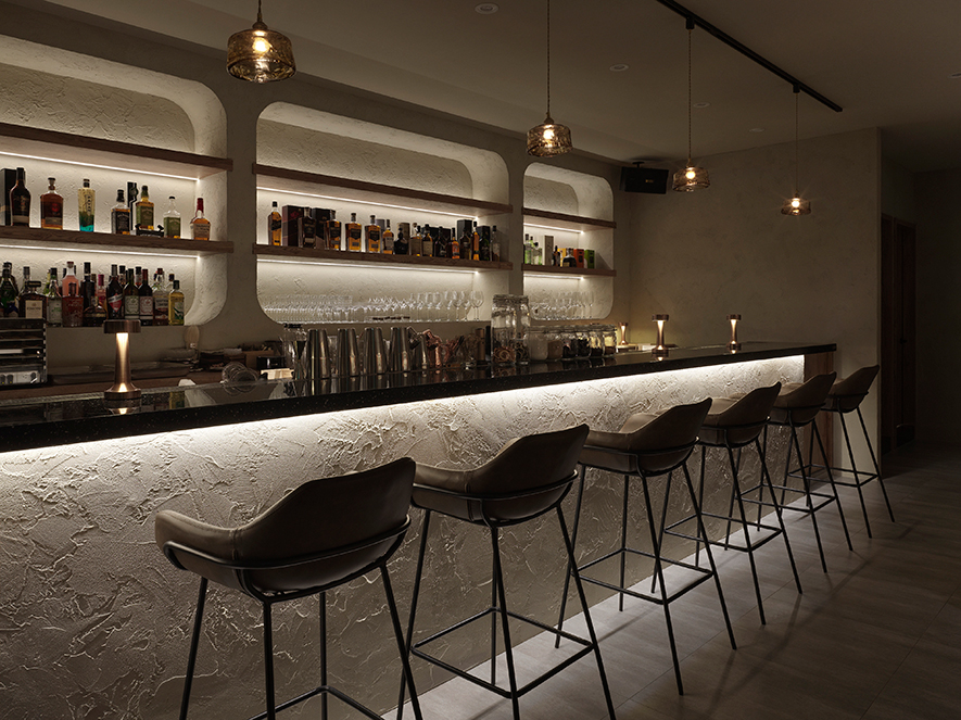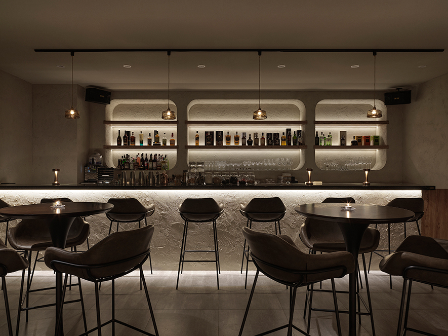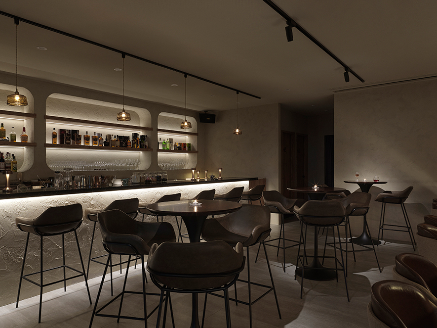 燈光設計聚焦吧臺區,以明亮光源突顯場域重心,其他區域漸次退去鋒芒,保留光影流動的餘韻,或靜照酒器內的浮冰、或點亮壁龕間的高矮瓶身,勾畫多變迷人的耐賞美景。全案牆面鏝抹粗糙特殊塗料,用餐區以手工挖鑿不規則洞孔,經圓角細磨與色差修飾,在粗獷基底中展現細緻工藝;左側吧臺續說相同語彙,保留混凝結構肌理,巧運間接光源與切角折射,讓牆面隨光而變,流露清醒與微醺之間曖昧不明的朦朧美感。