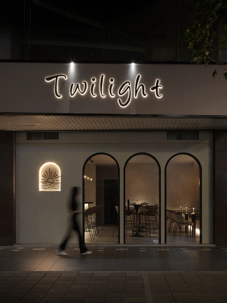 空間以店名「Twilight」為意象,營造黃昏過後的靜謐光景。日工設計 設計總監 王紹峰 跳脫酒吧常見的強烈視覺,以柔和包覆為餐酒館設計核心,透過奠下帶有安定感的奶茶主調,搭襯特殊塗料與圓潤邊角,柔化原始建築的銳利稜角,予以訪客內斂溫潤的放鬆觀感。燈光選用低色溫的暖黃光源,依場域機能勾勒、映射光影效果,使整體光感如同夕陽西下時的微光暈染,呼應商家logo的「暮光拱門」造型,創造優美怡情的品酒環境,亦成為連結品牌精神與空間感受的重要媒介。
