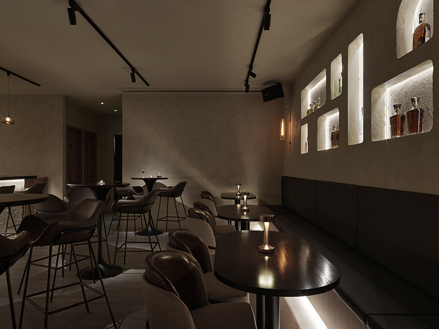 吧臺區相應對側用餐區牆面的挖鑿鏤空手法,結合展示與光束通透的雙重功能,將每方孔洞、壁龕精心排列,其間擺放風格各異的酒款,使瓶身在光源照射下,成為空間中的精美動態展品,而空間兩側如光牆般的流動端景,亦讓吧臺在備飲區機能外,化作醞釀柔雅氣氛的藝術裝置,讓品飲超越味覺感受,進一步轉成隨場域節奏流轉的沉心賞景之旅,並回應店內細膩的感知性與儀式性。