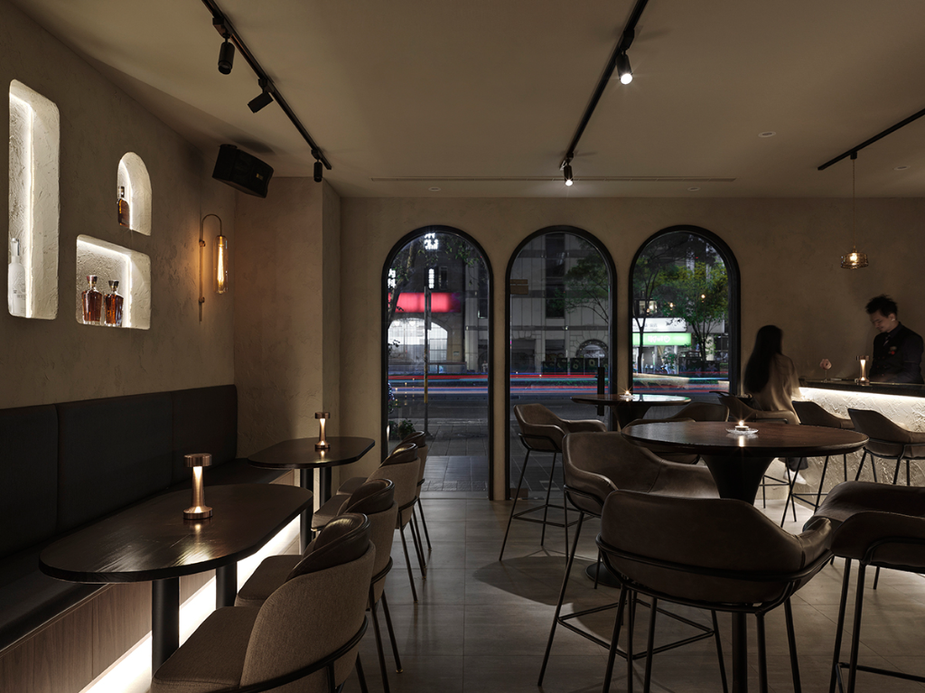 餐酒館門面不只是迎賓起點,更是帶入室內情境不可輕怠的前奏。室外門框與入口主視覺牆擷取品牌logo拱門符號,搭配內外呼應的光氛及弧形元素引導,模糊室內外界線,形塑飽含暖意且具包覆感的第一印象。柔光輕盈的親和性,在吸引過路者視線同時,也因拱形大門的開放包容感,降低人們踏入陌生店家前的防備心理,不自覺放慢腳步循光而入,展開一段由光影和材質引領的沉浸式感官體驗。