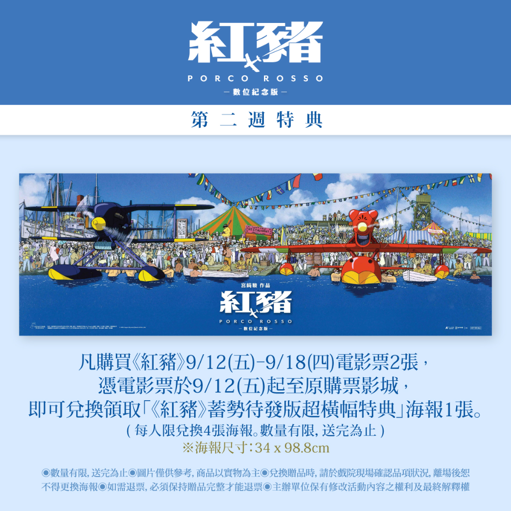為了回饋粉絲支持,《紅豬》上映第二周推出的「蓄勢待發版超橫幅特典海報」,採用34×98.8公分的大尺寸橫幅氣勢磅礡呈現,即將引爆收藏熱潮。只要於9月12日(四)至9月18日(三)期間,購買任一張《紅豬》電影票,憑票根即可至原購票影城兌換此款限量特典,每人最多可領取4張,數量有限,送完為止。這張橫幅海報不僅展現紅豬與卡地士戰機對峙的磅礡氣勢,更是《紅豬》粉絲不容錯過的夢幻收藏。
