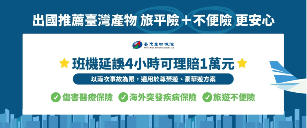 旅行途中您會擔心的事項,都可以透過臺灣產物保險的一站式旅遊保障幫助您解決。例如意外傷害、海外突發疾病醫療、班機延誤、旅程更改、行李損失、旅遊責任險等項目,讓您的每趟旅行都更有保障,不用擔心額外支出影響旅程與心情。