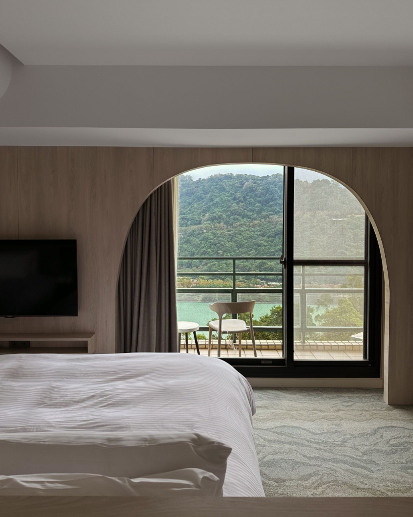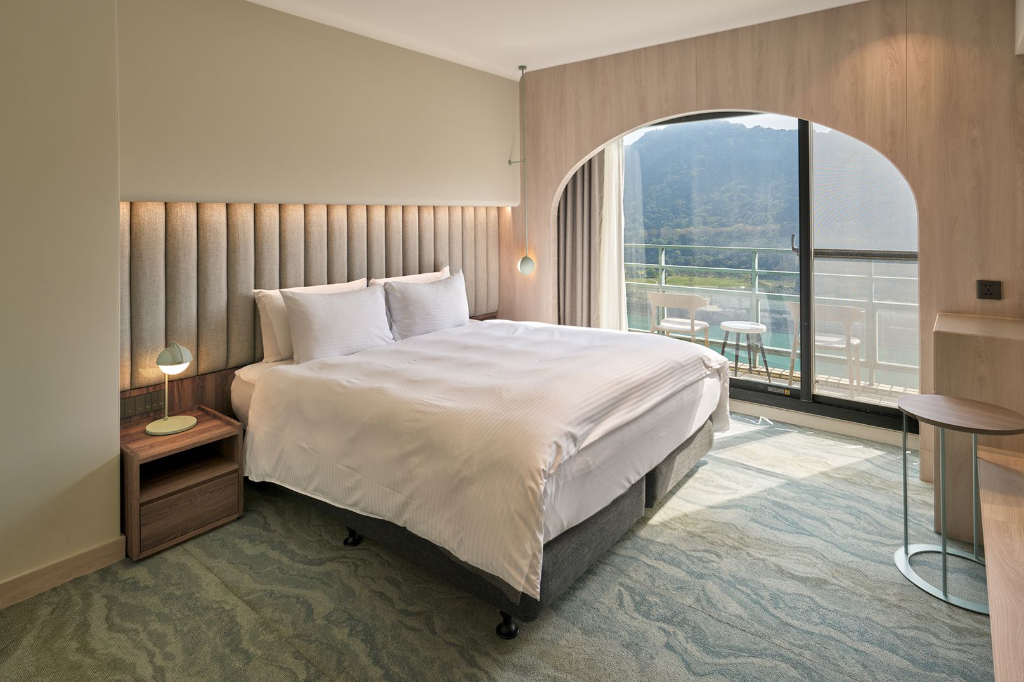 全館客房自近年改裝翻新後以文青簡約為主軸,大面積淺色原木將柔和湖水綠襯托,巧妙結合周遭的地貌色彩,交織出一片舒適又暖心的寢臥空間。所有房型設有獨立陽台,整片落地窗引入自然光源,推開便能迎接石門水庫的自然氣息,窗外蟲鳴與風聲成為最自然的伴奏,五感體驗在這片湖光山色間緩緩延展。