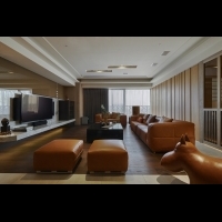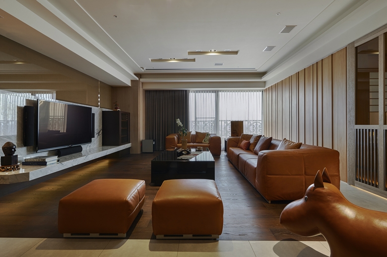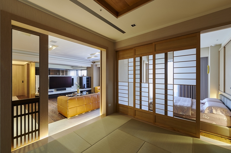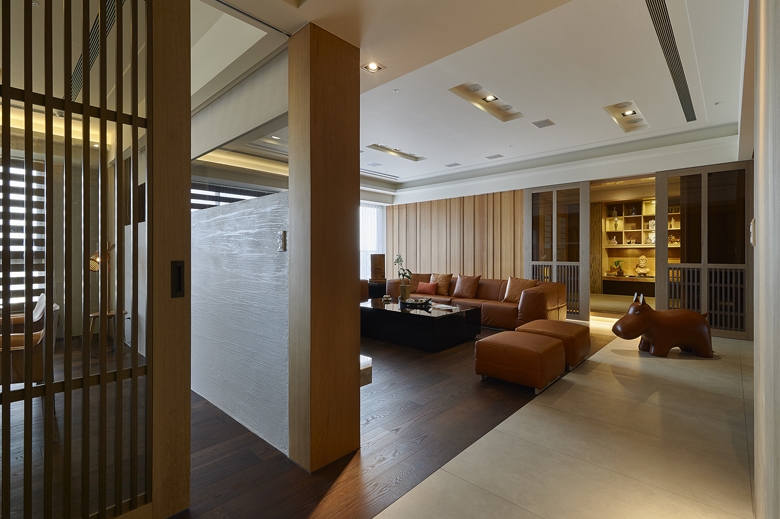 客廳主牆以茶玻搭配卡拉拉白大理石,衍生大器質韻;一旁香杉木的設計,寓意為整體空間的精神支柱,也是玄關進入室內的視覺焦點、區域劃分也是以此為軸心,向外發散式規劃。和室區域以貼膜玻璃、清玻等為主的雙開推拉門扉,界定與廳區的關係,於其間鋪設榻榻米,挹注溫馨底蘊,同時可以當獨立和室或客房使用,於沙發後方香杉實木壁板造型設計,隱去進入客房的開口,強調多功能機能規劃。