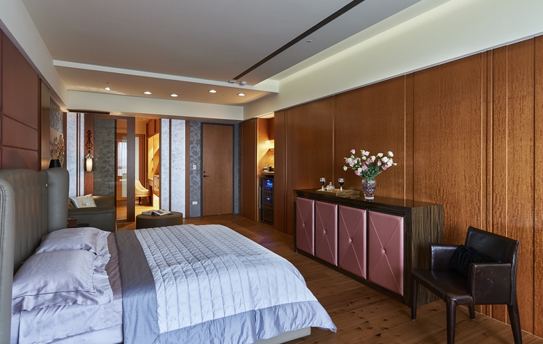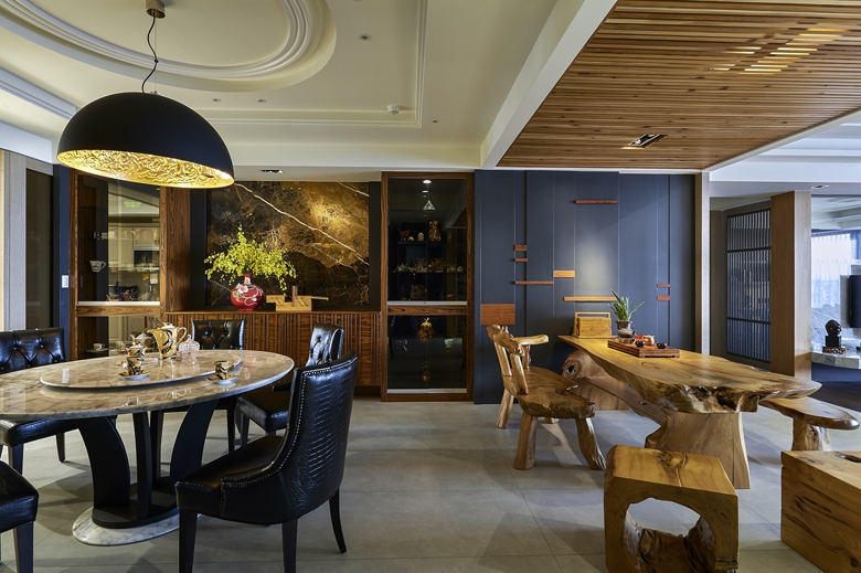 餐廳空間以新東方風格挹注,透過原木、大理石端景表情、義大利石材圓桌,以及透過雙開門扉與廚房界定,透過秩序性的排列回應原木的粗獷表情,均衡衝突的美感。泡茶區域也是以原木為主要材質表現,透過媒材延續性的表情,形成視覺上的層次感並強化空間的變化性,延伸廳區自然而自在的氛圍。