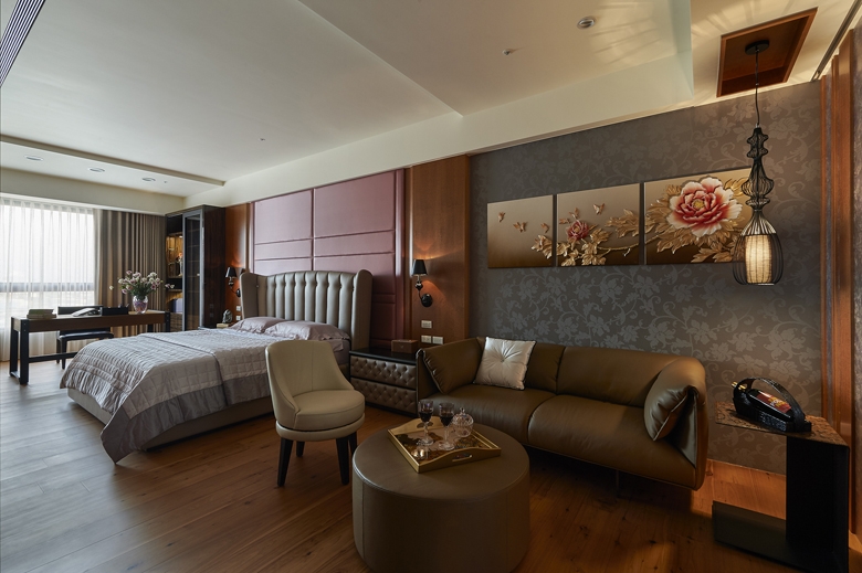 在整體空間以現代俐落融合質樸自然為設計主題的基礎,同時連貫空間開闊、通透的生活屬性,融合媒材局部粗獷質地作為與細膩工法的對比平衡,訂製家具與品牌家具的相互搭組,衍生出紓壓、溫潤的空間態度及表情,成就格局的規劃重點。