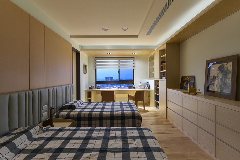 於玄關旁書房區域,透過珪藻土作為立面媒材,主要有效的調節空氣中的溼度、分解異味,同時無味、無甲醛,具環保意象;櫃體設計上運用花梨木、肖楠木、集層實木設計,讓滿室享有原木芬多精的清香包覆,搭配具品牌形象的桌椅,圍塑出人文溫潤的閱讀底蘊。