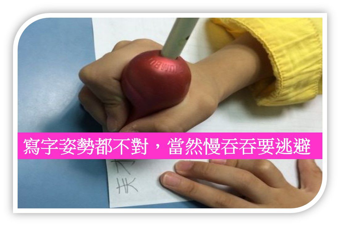 反之,若孩子們的握筆方式,會讓寫字的效率以及寫功課表現很差,拖拖拉拉及哭哭啼啼,那就要針對問題去改善了,決不是交到安親班讓老師盯完功課就可以的。建議可以是用專業的學習握筆器先試試看,但如寫字效率差,還是要請專家協助評估孩子的手不協調問題!因為,有可能是手指和虎口的肌耐力不佳,需要用一些活動或遊戲來提升手部運作的效率,這樣搭配握筆器才會更有效果的。