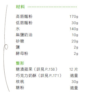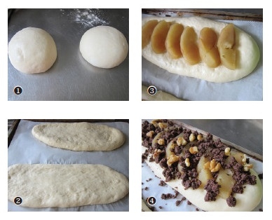 4. 發酵完成後,在麵糰表面擺放糖漬蘋果❸,以及巧克力奶酥、核桃❹。