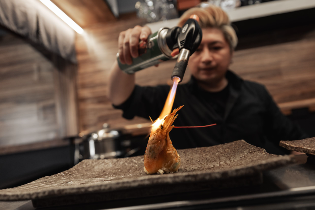 主廚的背景,更讓一道道上桌的料理顯得厚實而可靠。他擁有近二十年日本料理經驗,曾在多家無菜單料理餐廳歷練,將「現點現做」的靈活精神帶入固定菜單。對他而言,每一道料理都不是制式流程,而是與客人之間的專屬對話。刀工的俐落、火候的精準,乃至於調味的拿捏,都是一種不斷練習卻依舊保持真誠的日常。
