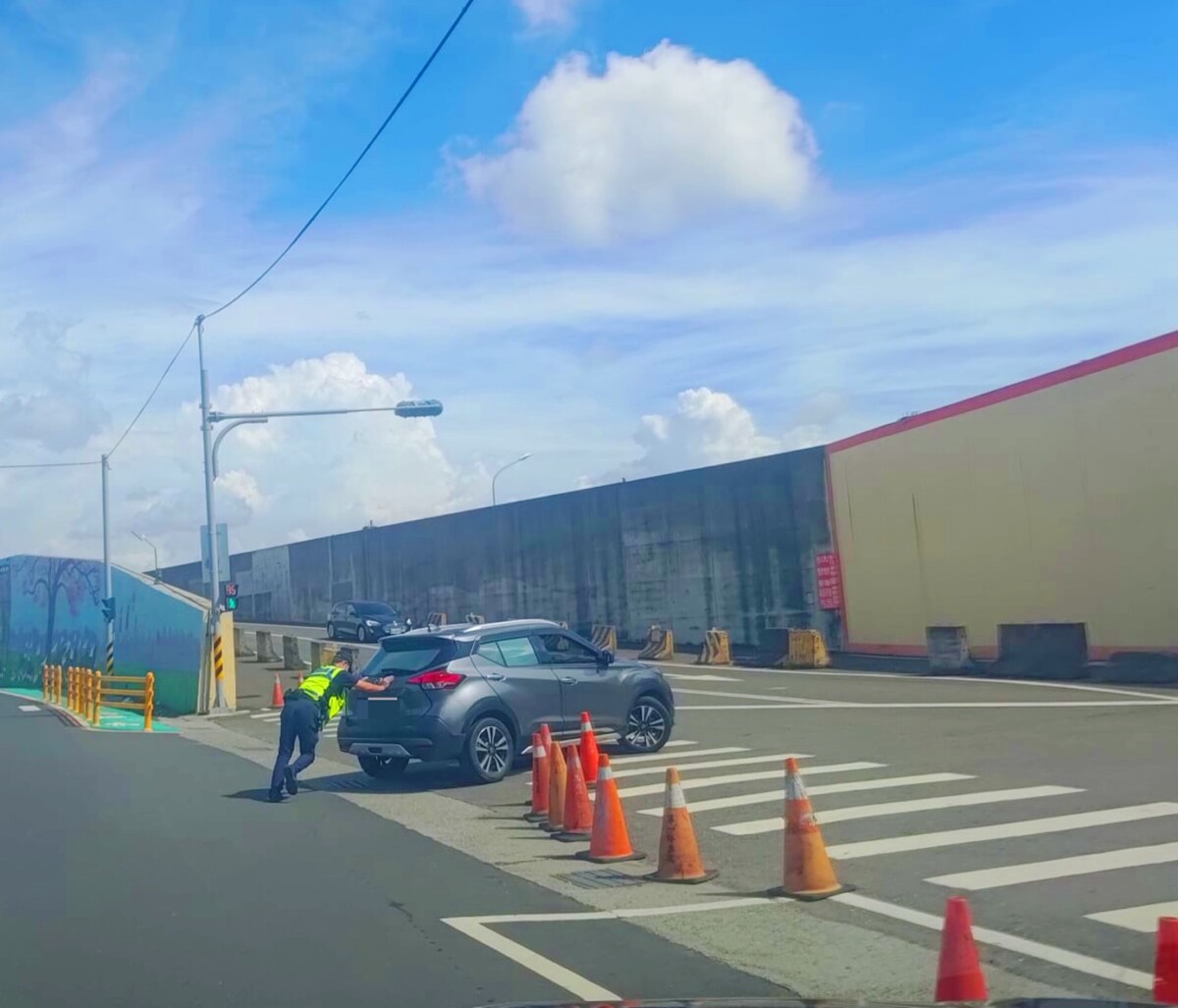 兩位員警到達現場後,發現該輛白色小客車因不明故障,停在紅燈等待區無法移動,且駕駛簡姓男子雖已聯繫拖吊車,卻需一小時以上才能到場。此時正逢中午交通尖峰,車流持續增加,險象環生。