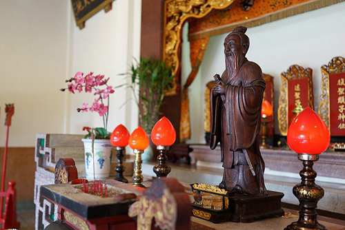 櫺星門平常都是大門深鎖,一般人只能從禮門旁的小門進去孔廟。介於櫺星門和大成殿中間,還有孔子塑像及魚池,兩旁還設有涼亭。最特別的是,廟內還飼養孔雀呢,幸運的話,你會看到華麗的孔雀開屏哦。